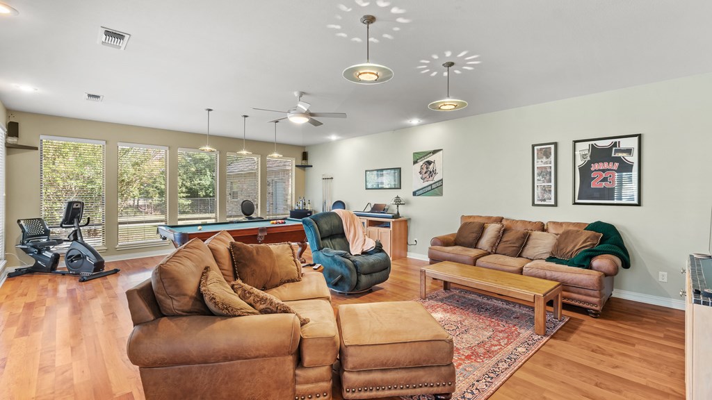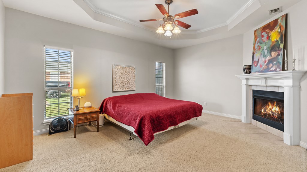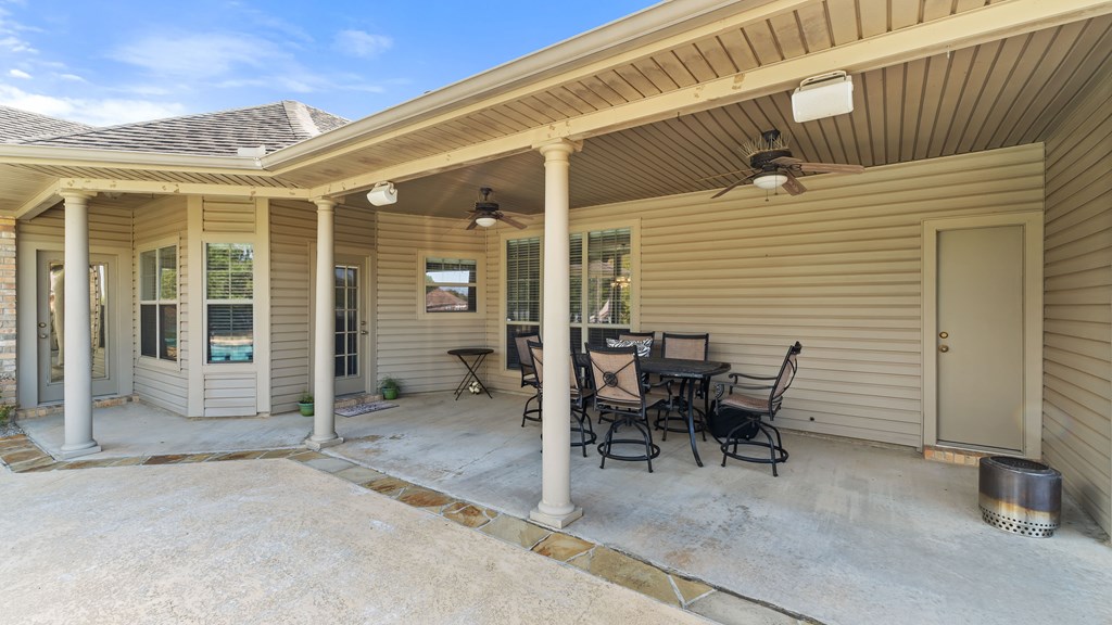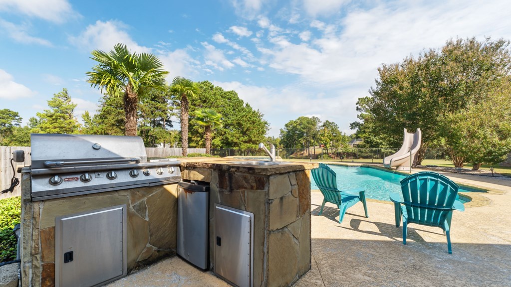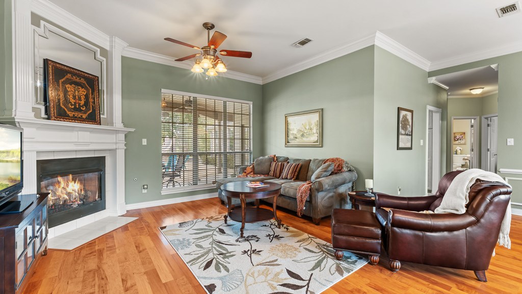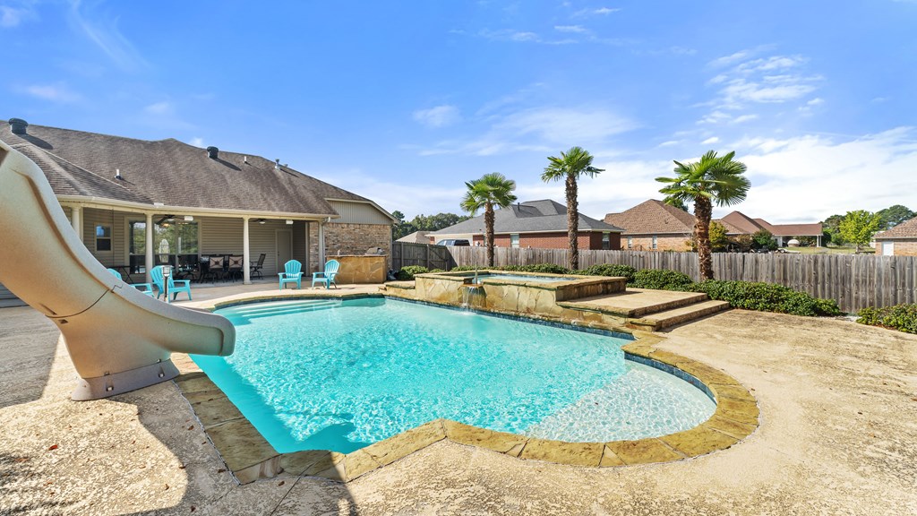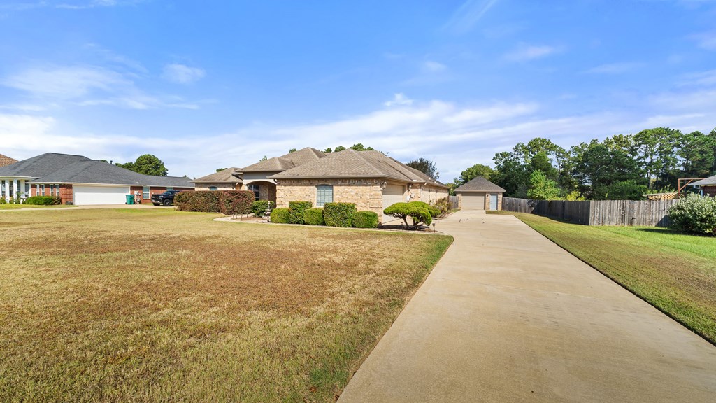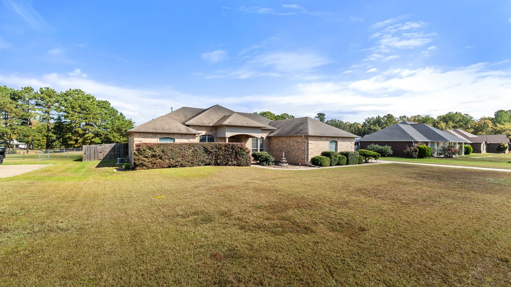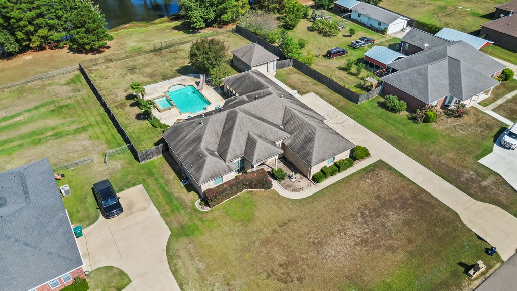 WOW, this one has Slashed the Price, it is a great opportunity for some one who needs space. Inground Gunite Pool and Spa, and 2 Living areas, THIS ONE IS A NO BRAINER. This is the view you have been searching for. Wake up to watch the mist evaporate over the lake from this superb property. A true oasis, this home features two fireplaces, a hot tub, and an inground Gunite saltwater pool overlooking the water. You have to see it to believe it. The home has it all, including two living areas and a large kitchen with an island, all with windows focused on the beauty of the pool and lake. A convenient bathroom provides direct access to the pool area. An extra single garage is perfect for your tools or hobbies. The large master suite boasts its own fireplace for extra ambiance. A dedicated office can easily serve as a fourth bedroom. Wood flooring runs through the main areas, with tile in the kitchen and carpet in the bedrooms. An extra-long drive provides ample parking, and a side gate allows you to enter the backyard oasis without going through the house. The den, with its multiple windows, offers stunning views and abundant natural light in a very private part of the home. Outside, enjoy a built-in grilling area with a refrigerator, surrounded by mature crepe myrtles blooming in a rich fuchsia hue.