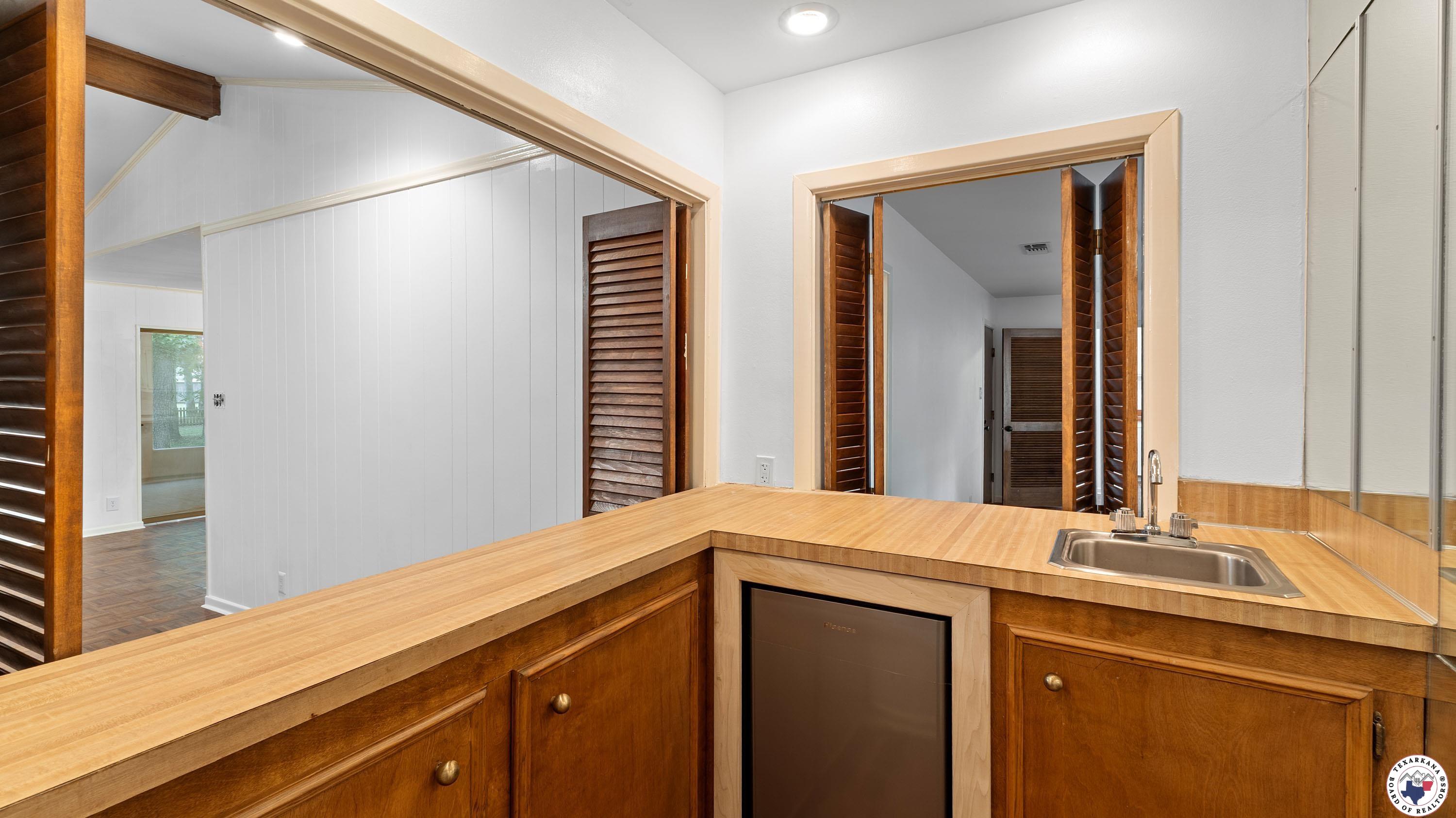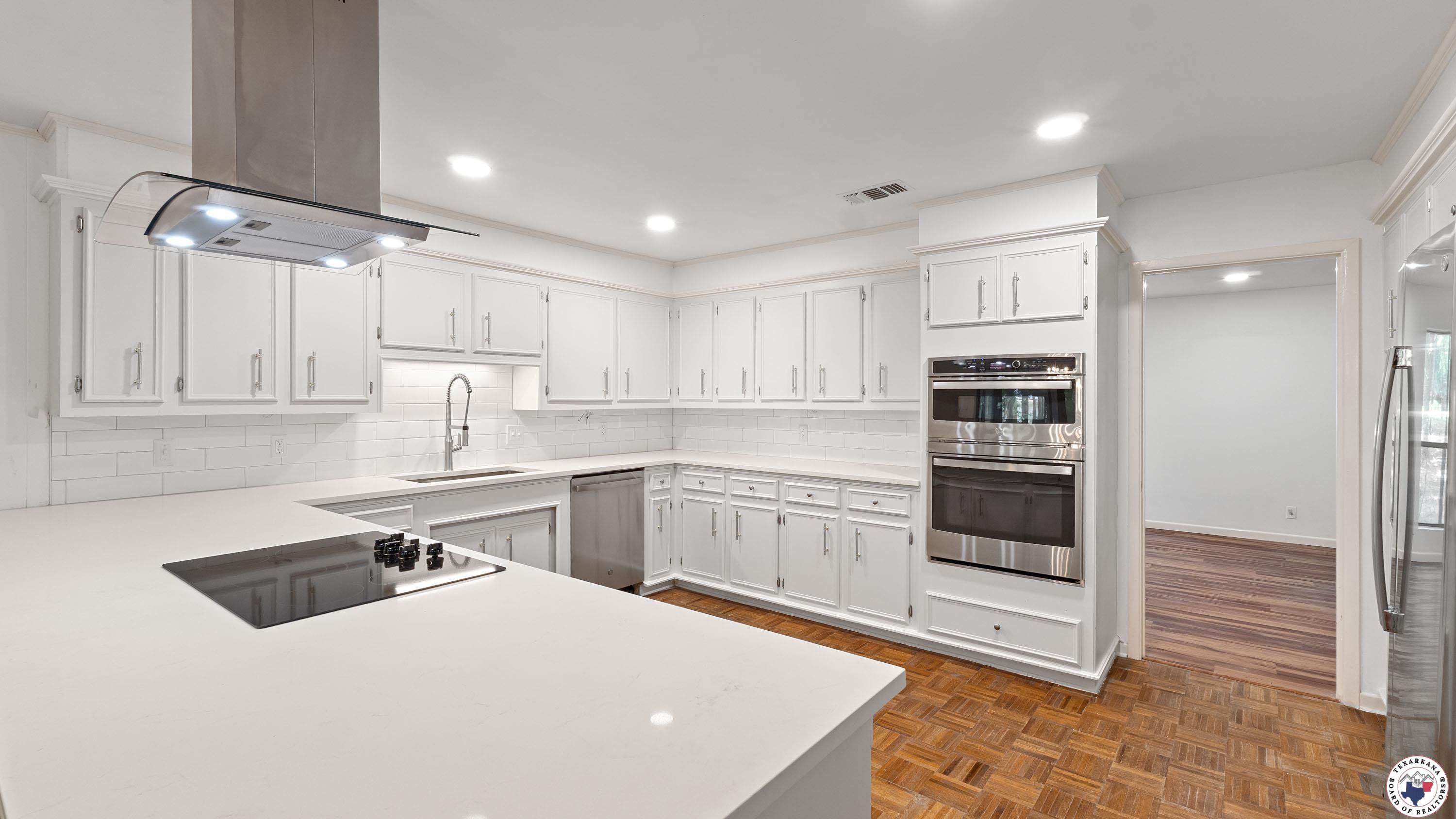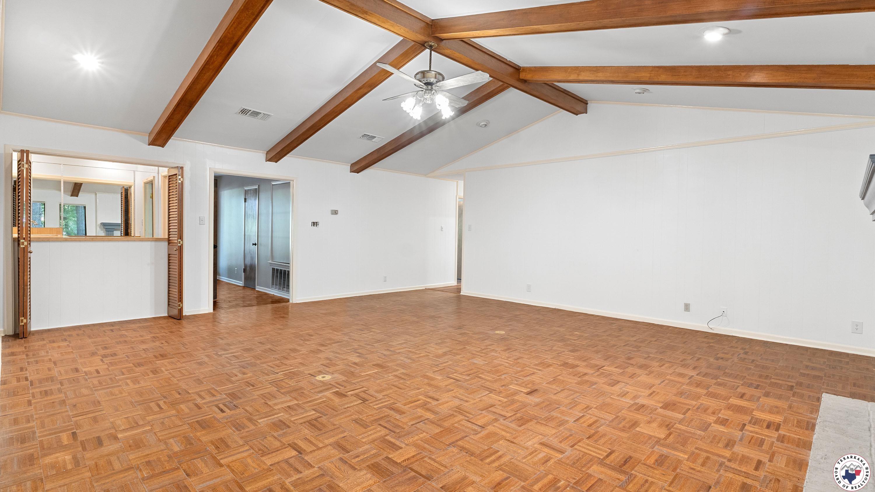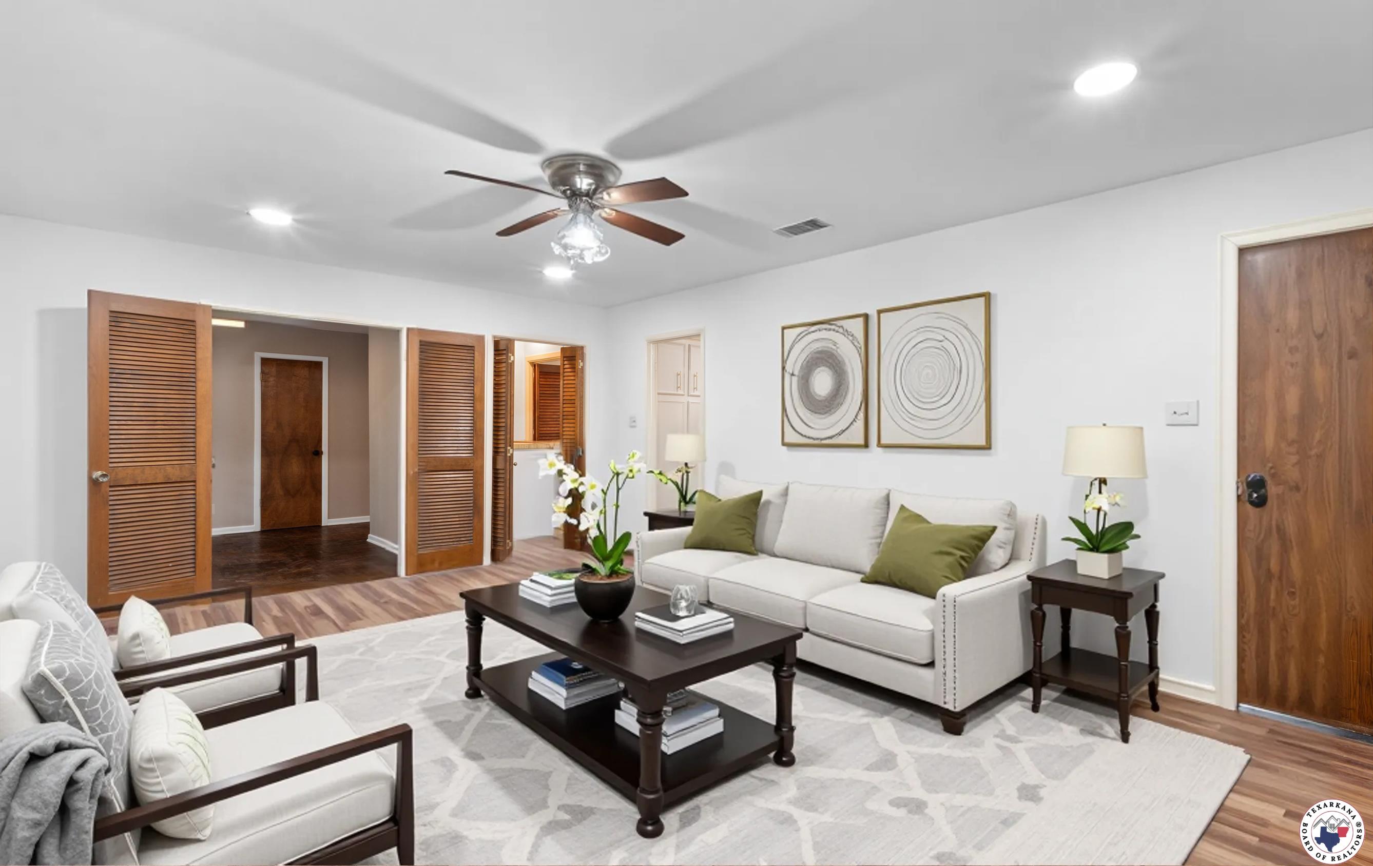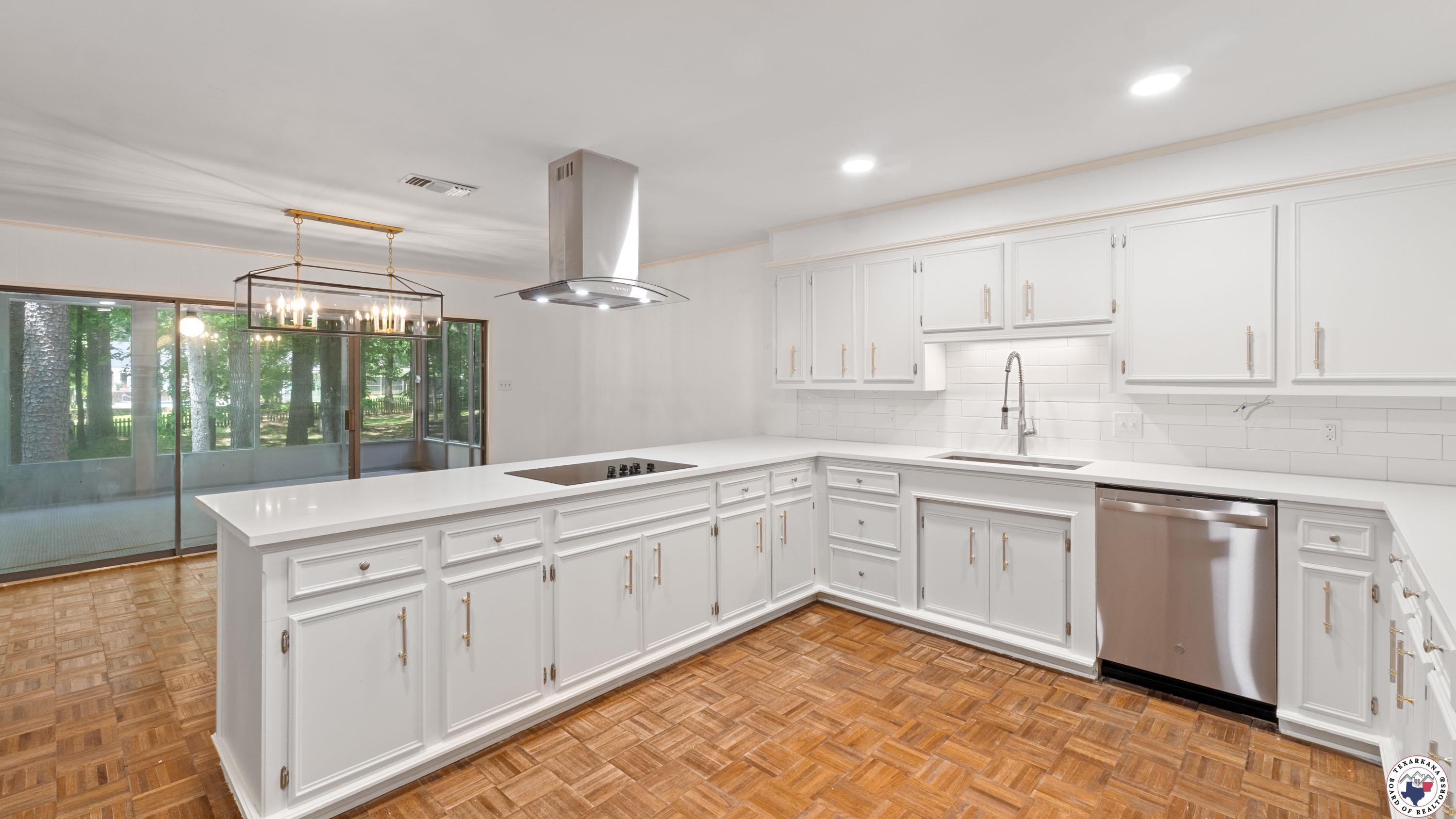 This stunning contemporary home is thoughtfully designed for effortless entertaining, offering a spacious open layout, a large kitchen, vaulted ceilings, and a charming wood-burning fireplace. The property backs onto a serene stand of trees, where you can often catch glimpses of wildlife from the comfort of your enclosed back porch. This versatile space also serves as a third living area. Situated in the heart of Pleasant Grove, the neighborhood exudes charm and provides an ideal setting for jogging or leisurely walks through its tranquil, park-like surroundings. The home has recently undergone significant upgrades, including sleek new quartz countertops, brand-new appliances. Designer lighting enhances the space, creating a warm and inviting atmosphere, while the preserved original parquet flooring adds character to the contemporary design. The primary bedroom is a true retreat, featuring a freestanding soaking tub, elegant sconces framing the quartz vanity, and a cozy vanity area. The family room is ideal for entertaining, complete with a wet bar, while the enclosed back patio offers a perfect space to unwind in privacy. There is an additional Room for Living/or office space and could easily convert to a 4th Bedroom. Practicality meets convenience with a large laundry room equipped with a washer and dryer, alongside a half-bath for added functionality. This is in addition to the two full bathrooms between 2 Bedrooms. This home has no carpet for ease of interior maintenance & a well & sprinkler system for exterior upkeep.