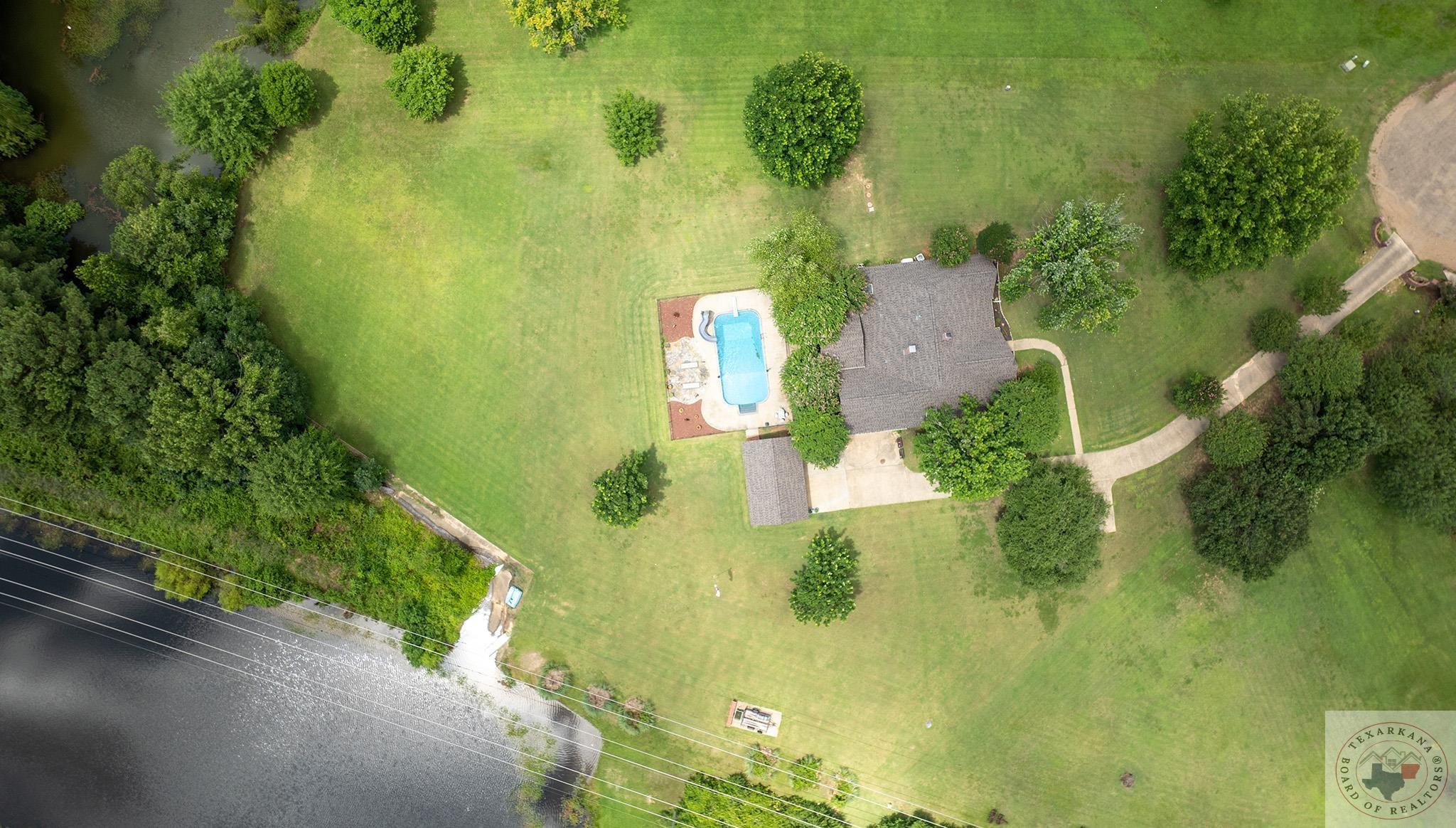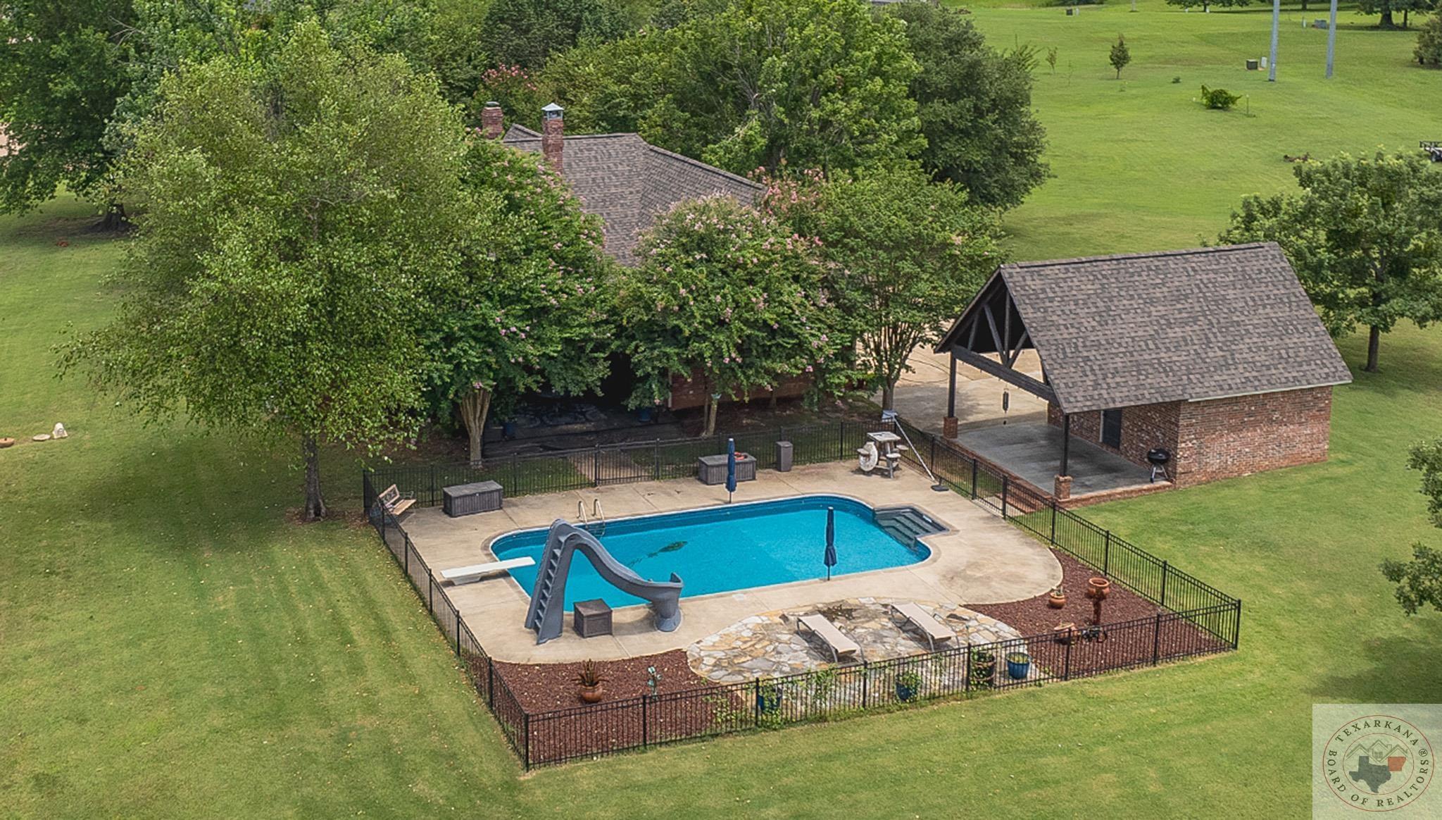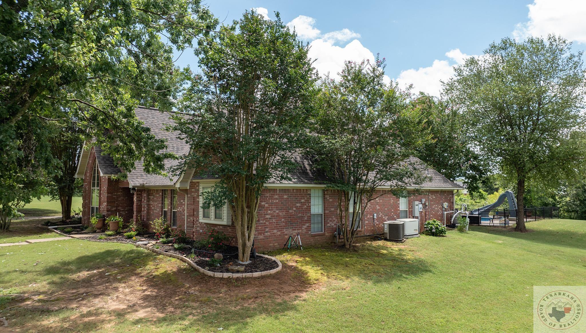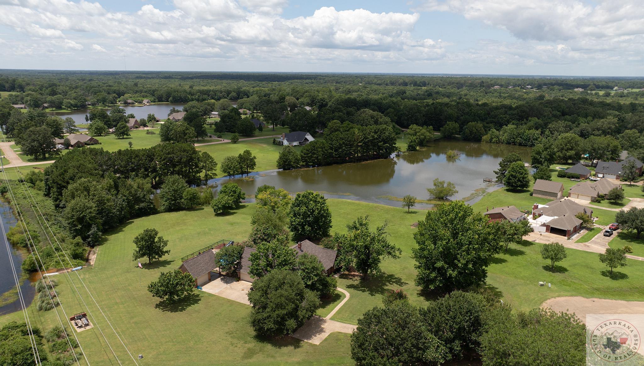 Dreaming of waterfront living? This home boasts two serene lakes flanking each side with an overflow dam. Nestled in a picturesque neighborhood known for its stunning lakefront properties, this abode is the epitome of a tranquil retreat just beyond the city limits. Relax knowing it's equipped with a whole-house generator and a new hail-resistant roof. The kitchen shines with exquisite quartz countertops and top-of-the-line Kitchen Aid stainless steel appliances. Enjoy the reliability of natural gas, Swepco power, and a well water filtration system. Outdoors, a 20 x 36 pool with a new liner awaits within a wrought iron fence, complemented by a deck with a vaulted ceiling, perfect for alfresco gatherings. Explore the two fireplaces, both can convert to wood burning, currently both are gas logs. Discover two distinct living areas - one formal, the other evoking a mountain retreat. A spacious garage with built-in cabinets and a climate-controlled storage room provide ample space. The detached garage also has a carport which blocks the pool from your neighbors, this is a very private back porch. Bask in the natural light of the office just off the Breakfast area, with window walls and featuring a skylight. Intrigued? Prepare to be enchanted the moment you step inside. New Roof in 24 and house Generator connected in 2022, HVAC is 7 years old.