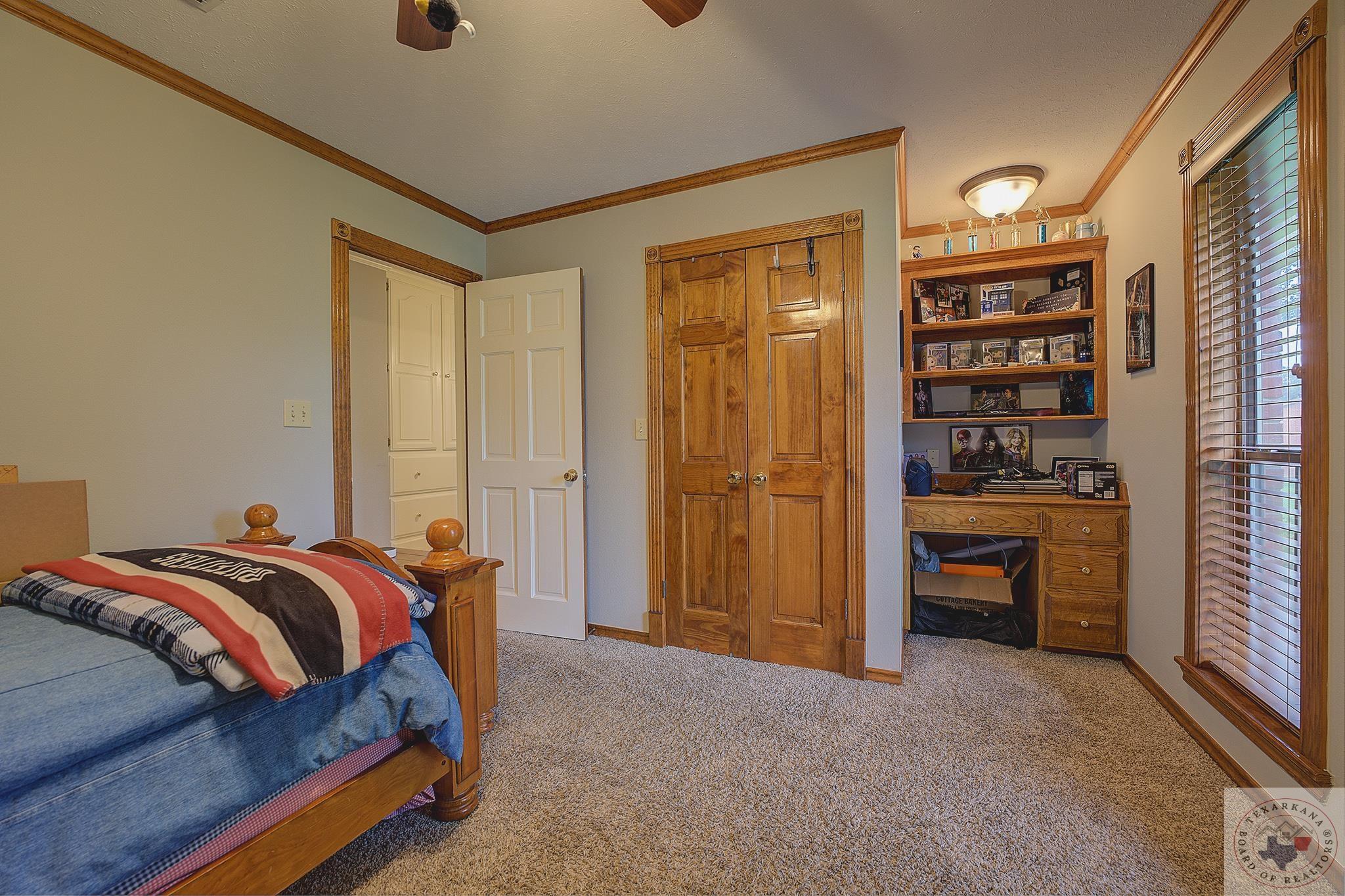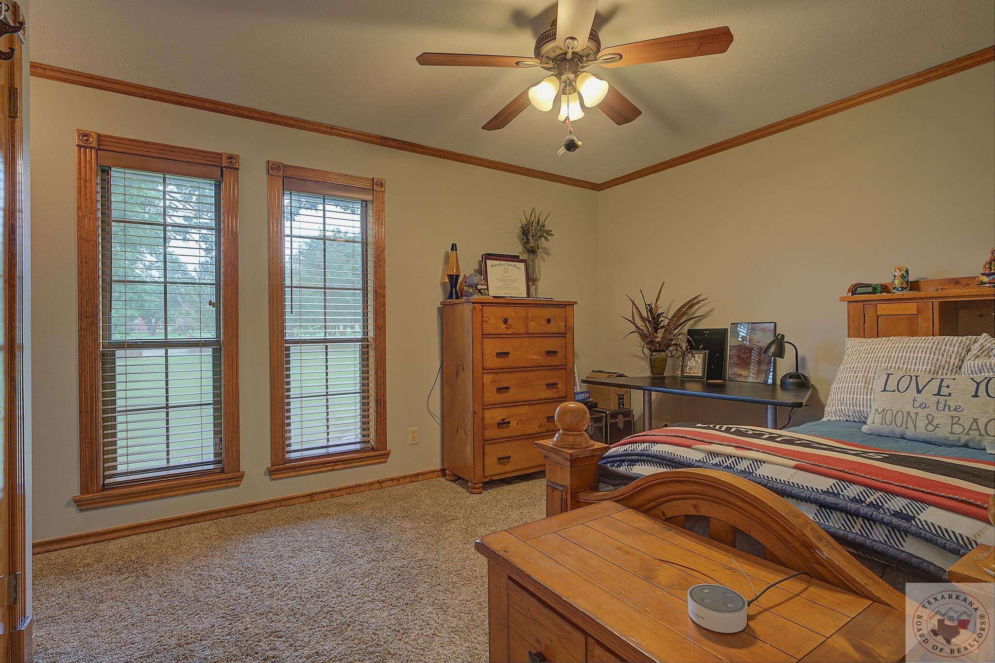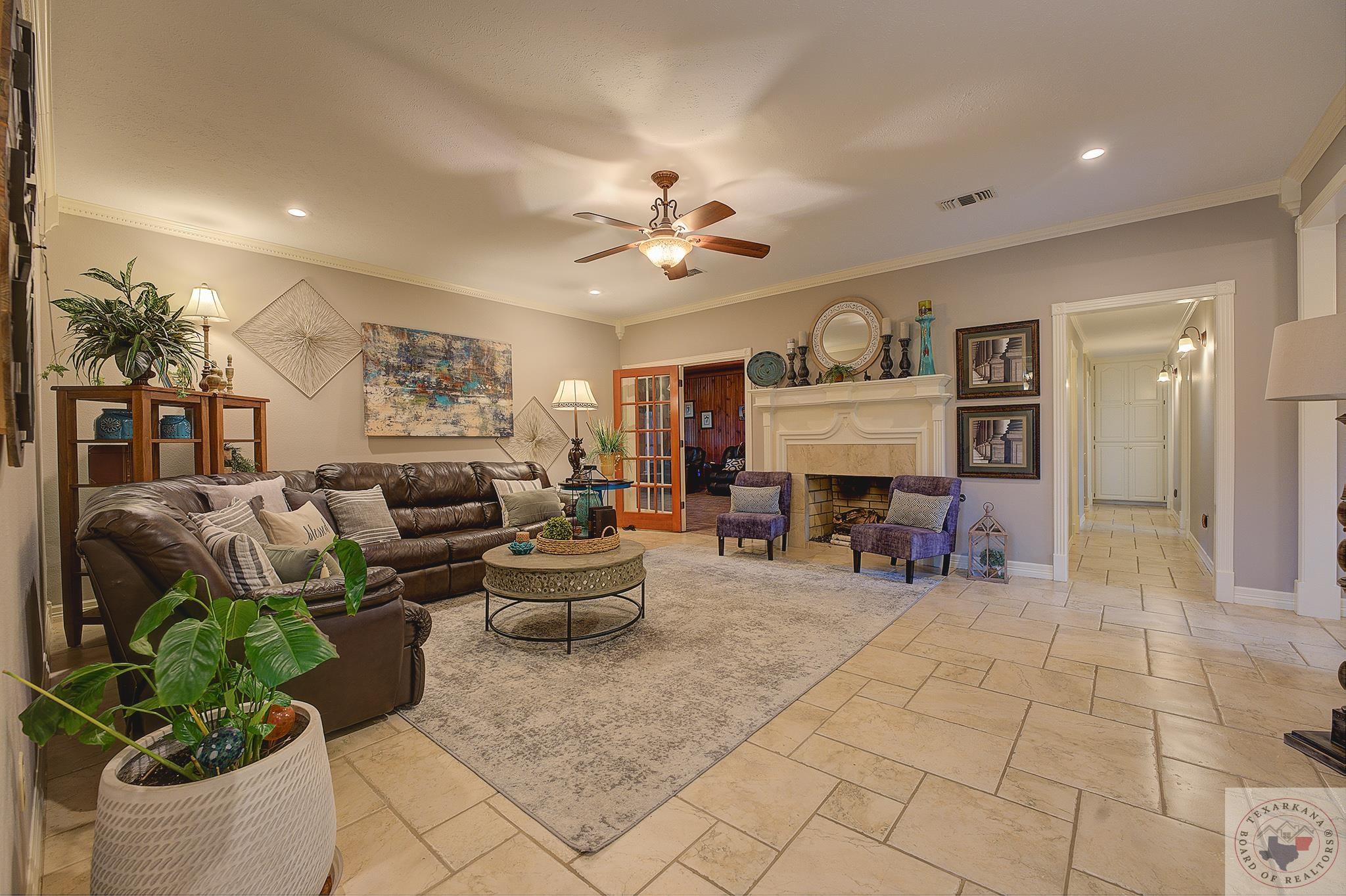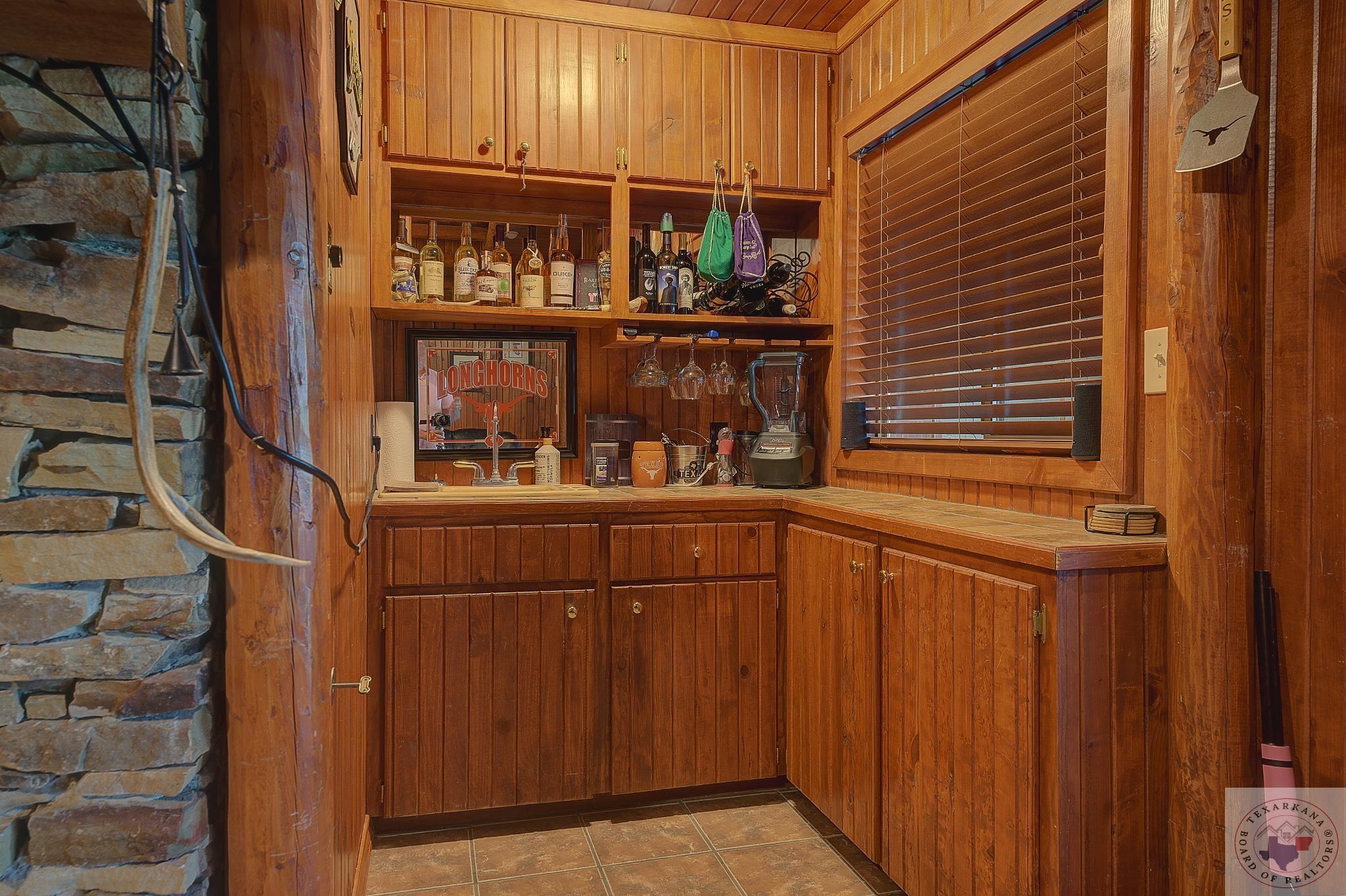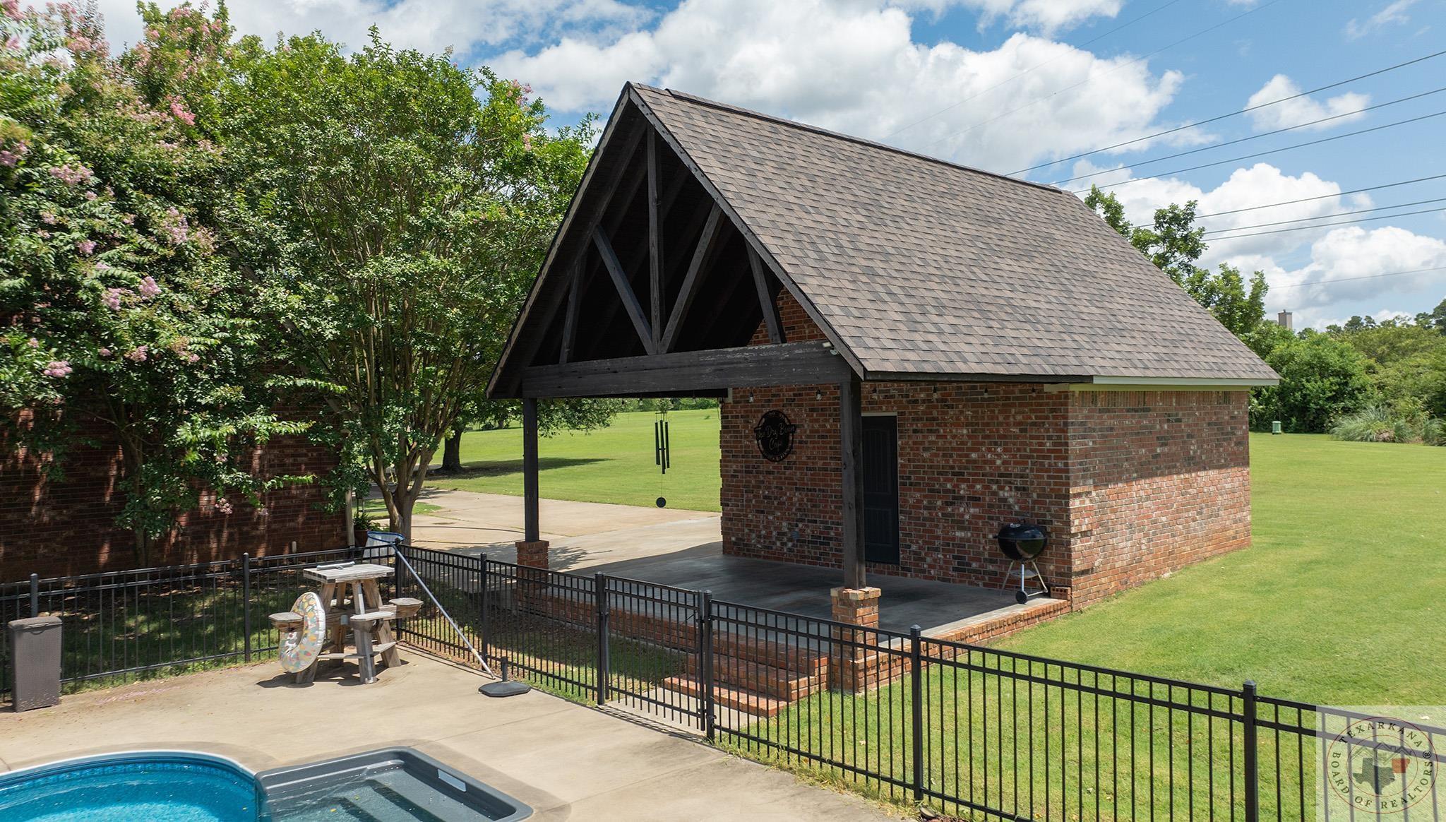 Dreaming of waterfront living? This home boasts two serene lakes flanking each side with an overflow dam. Nestled in a picturesque neighborhood known for its stunning lakefront properties, this abode is the epitome of a tranquil retreat just beyond the city limits. Relax knowing it's equipped with a whole-house generator and a new hail-resistant roof. The kitchen shines with exquisite quartz countertops and top-of-the-line Kitchen Aid stainless steel appliances. Enjoy the reliability of natural gas, Swepco power, and a well water filtration system. Outdoors, a 20 x 36 pool with a new liner awaits within a wrought iron fence, complemented by a deck with a vaulted ceiling, perfect for alfresco gatherings. Explore the two fireplaces, both can convert to wood burning, currently both are gas logs. Discover two distinct living areas - one formal, the other evoking a mountain retreat. A spacious garage with built-in cabinets and a climate-controlled storage room provide ample space. The detached garage also has a carport which blocks the pool from your neighbors, this is a very private back porch. Bask in the natural light of the office just off the Breakfast area, with window walls and featuring a skylight. Intrigued? Prepare to be enchanted the moment you step inside. New Roof in 24 and house Generator connected in 2022, HVAC is 7 years old.