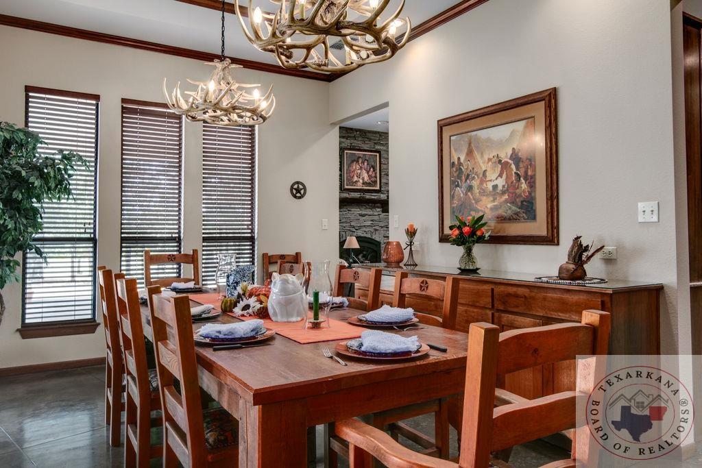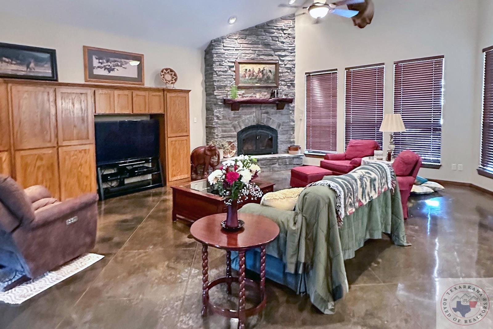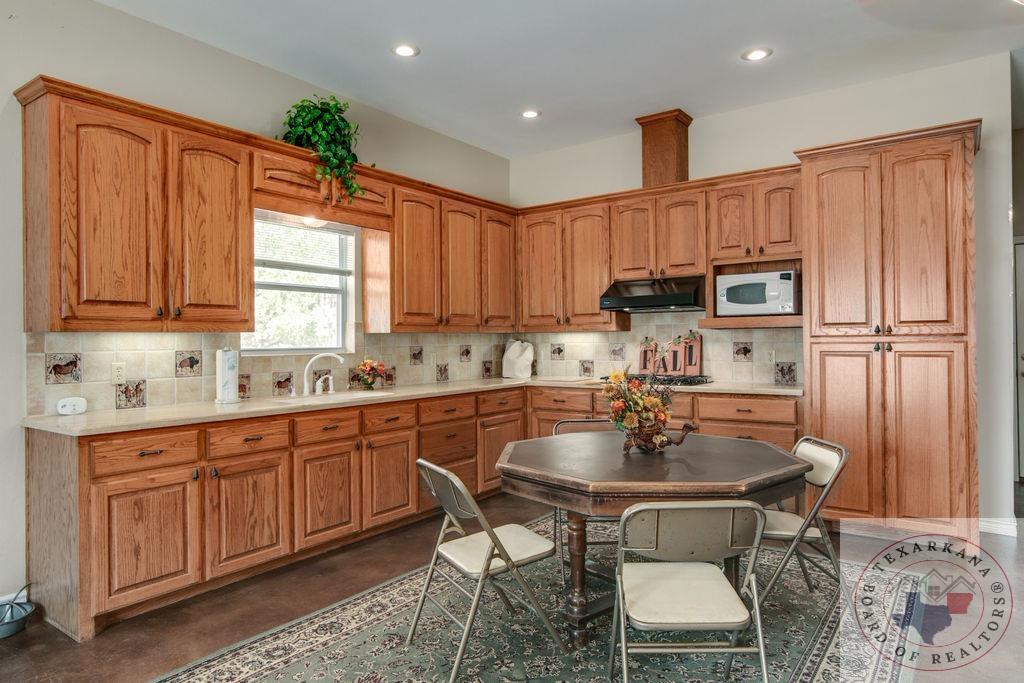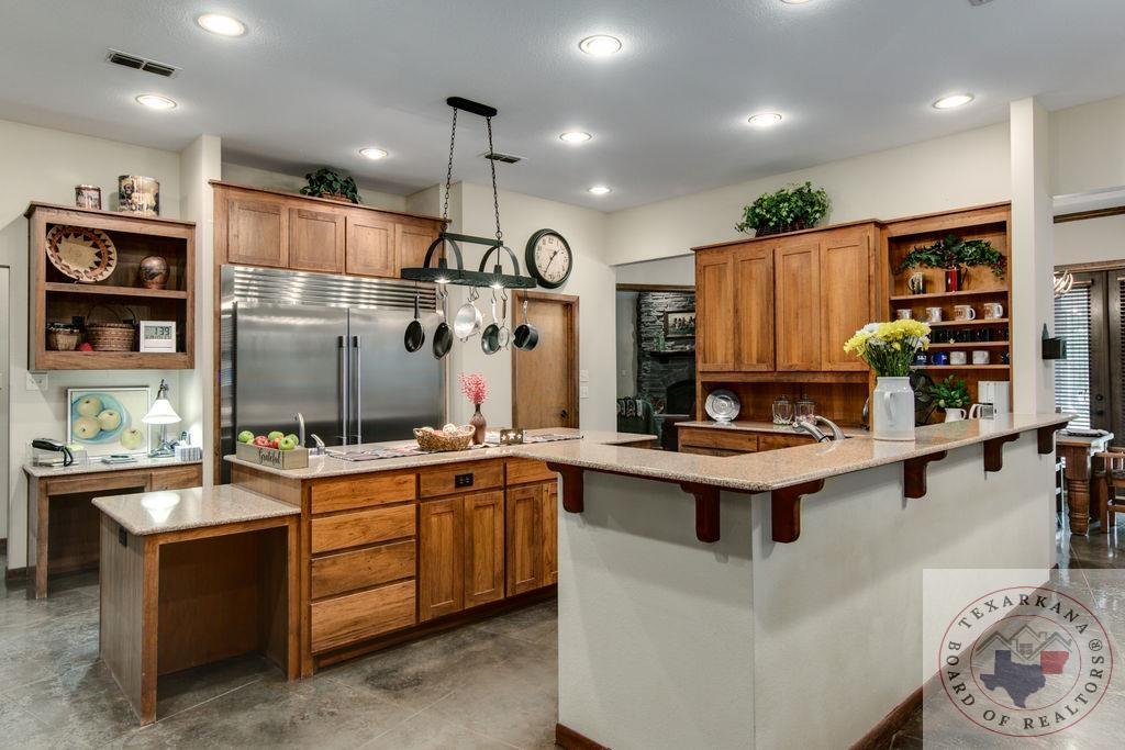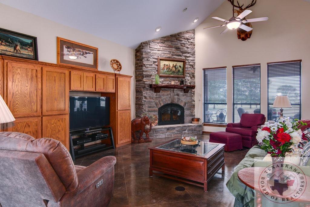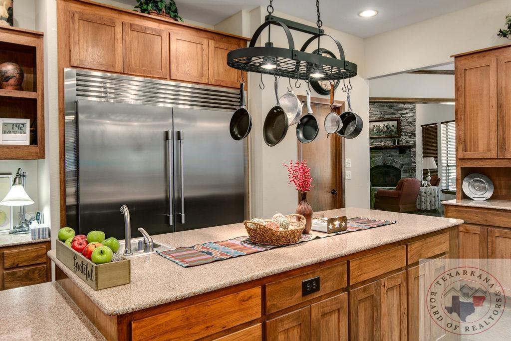 Experience the charm of Texas in this unique property featuring Texas White Limestone. With its soaring ceilings, warm pecan finishes, and scored concrete floors throughout, this home offers a touch of elegance. The envy of your neighbors, the property boasts a 730-foot well providing the best-tasting water in town. Step inside to discover porcelain fixtures that appear brand new, a testament to their impeccable condition. Custom-built with west-facing porches, you can savor captivating sunsets each evening. The solid steel roof not only keeps your home dry but also helps lower insurance premiums. Perfect for equestrian enthusiasts or other projects, this property is ideally situated near Lake of the Pines and Wright Patman for those who enjoy fishing. With low maintenance in mind, sidewalks encircle the entire house. And let's not forget the amazing kitchenGa haven that invites you to unleash your culinary creativity. It boasts a huge Sub Zero-like stainless refrigerator/freezer and a Thermador dual fuel range with electric convection oven. Designed for effortless entertaining, the property features quartz countertops that beautifully complement the soft pecan stain on the cabinets. The cabinets themselves showcase a modified shaker style without any hardware. The property also offers a well-insulated shop, perfect for safeguarding equipment. Additionally, you'll find a 900 sq ft living quarters within the shop. This space features a kitchen, laundry area, bedroom, spacious closet, and an open living area, all exuding the same level of quality as the main house.