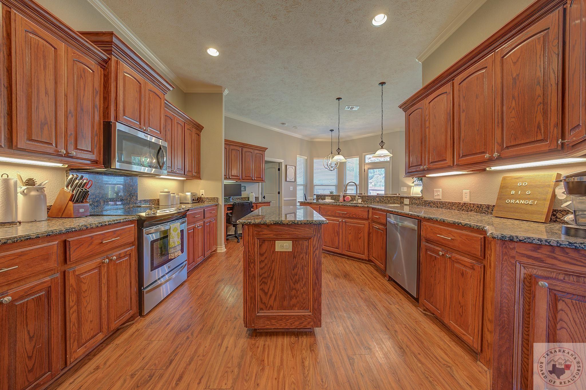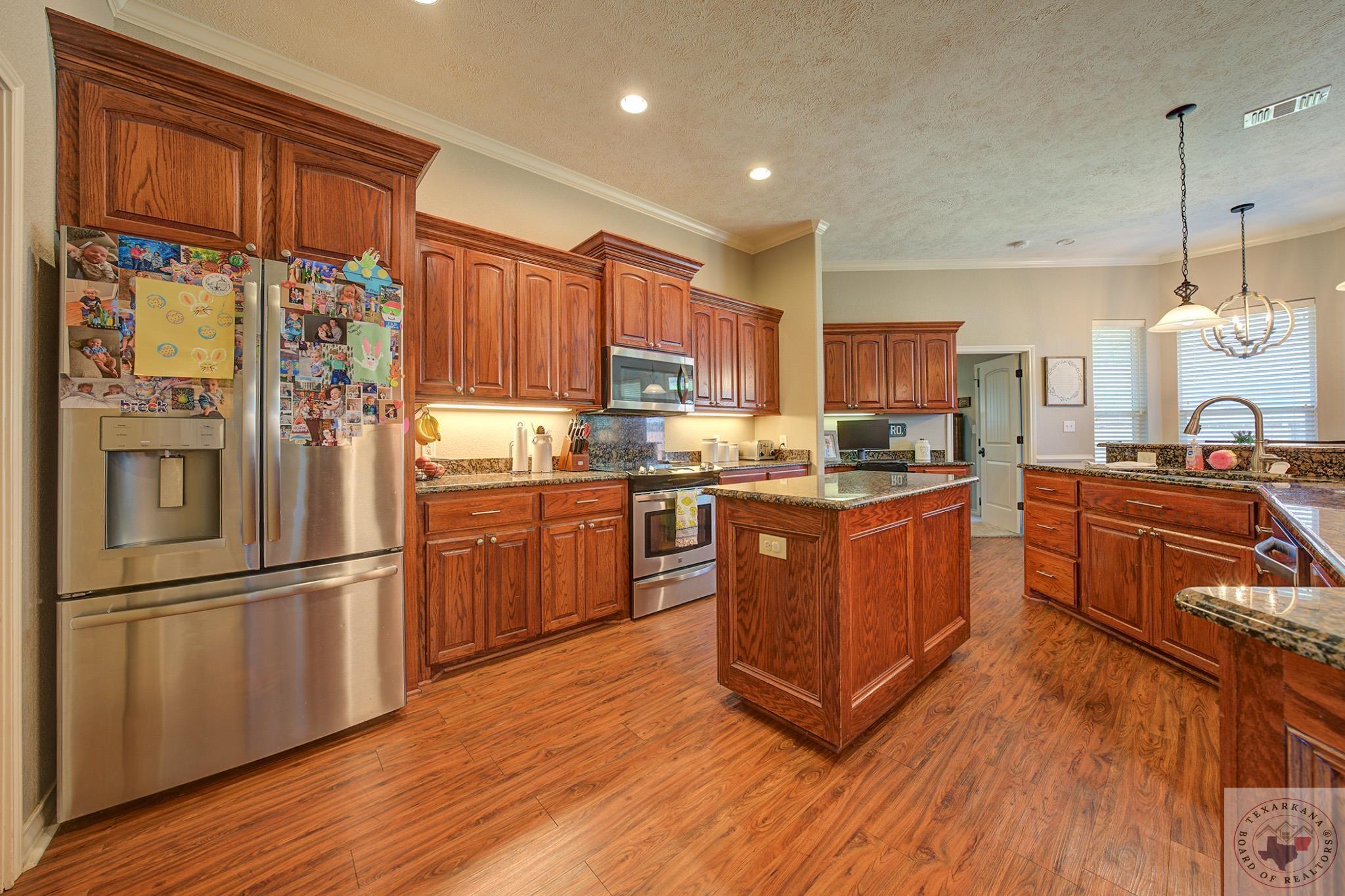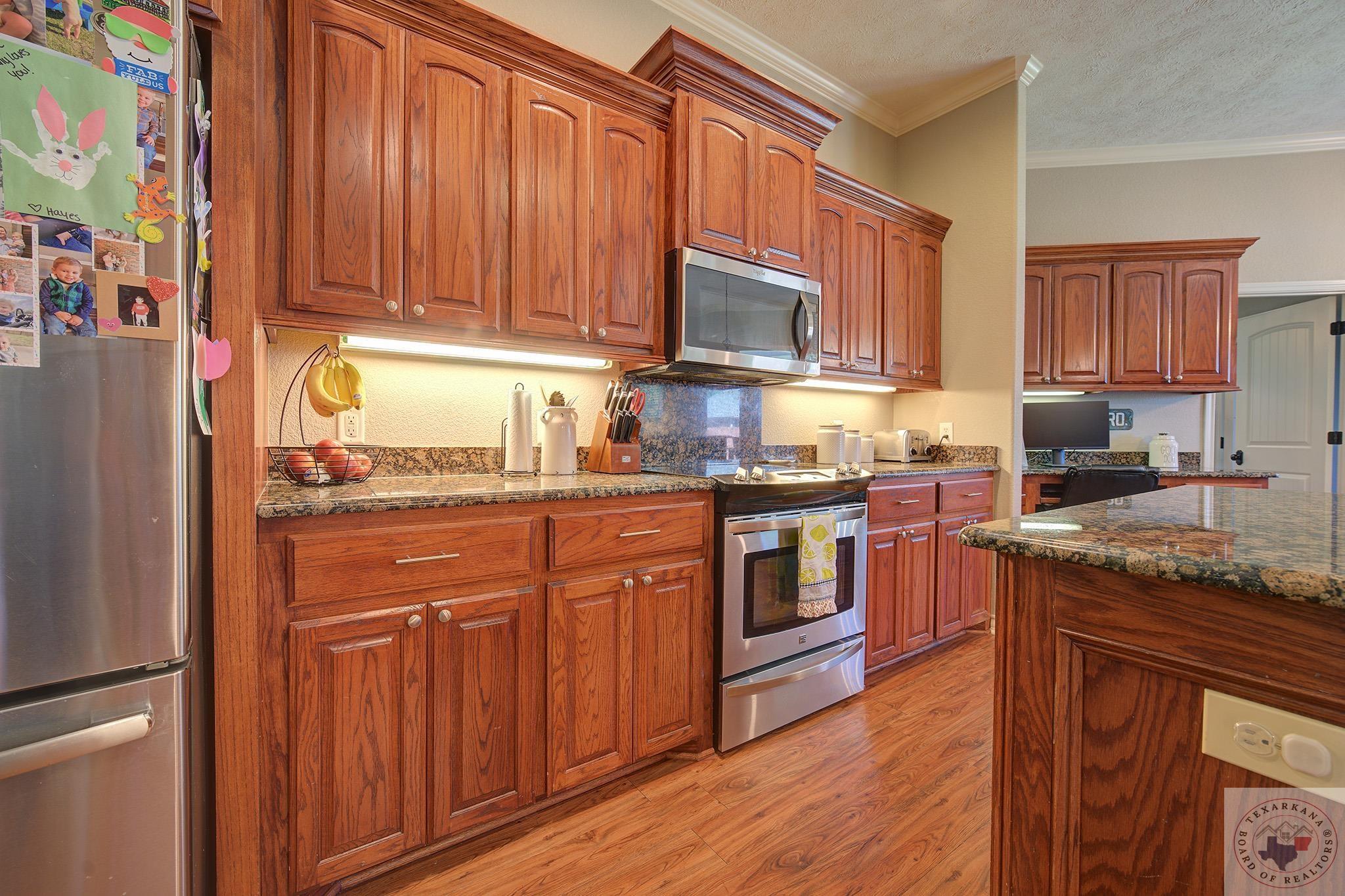 Inviting home with a touch of charm, nestled on a ridge with a lush green lawn. Step onto the welcoming porch and through the beautiful leaded glass doorway. Explore the expansive kitchen, boasting abundant cabinets with a rich wood finish, a central island, and stainless steel appliances. The Baltic Brown Granite complements the sleek black accents throughout the house, perfect for family gatherings. Relax on the spacious covered back patio while the kids play in the yard. The living room offers a cozy corner fireplace and easy-to-maintain flooring. The oversized Master Suite features a generous dressing area, mirrors for a flawless look, ample closet space with built-in features, and a corner spa tub for unwinding. The bathroom layout includes a private water closet, and the master bedroom accommodates large furniture and offers a Tray ceiling for beauty. Ample storage, cabinets, and a well-organized laundry area complete this comfortable home. The yard is simply fabulous for any buyer to take over.