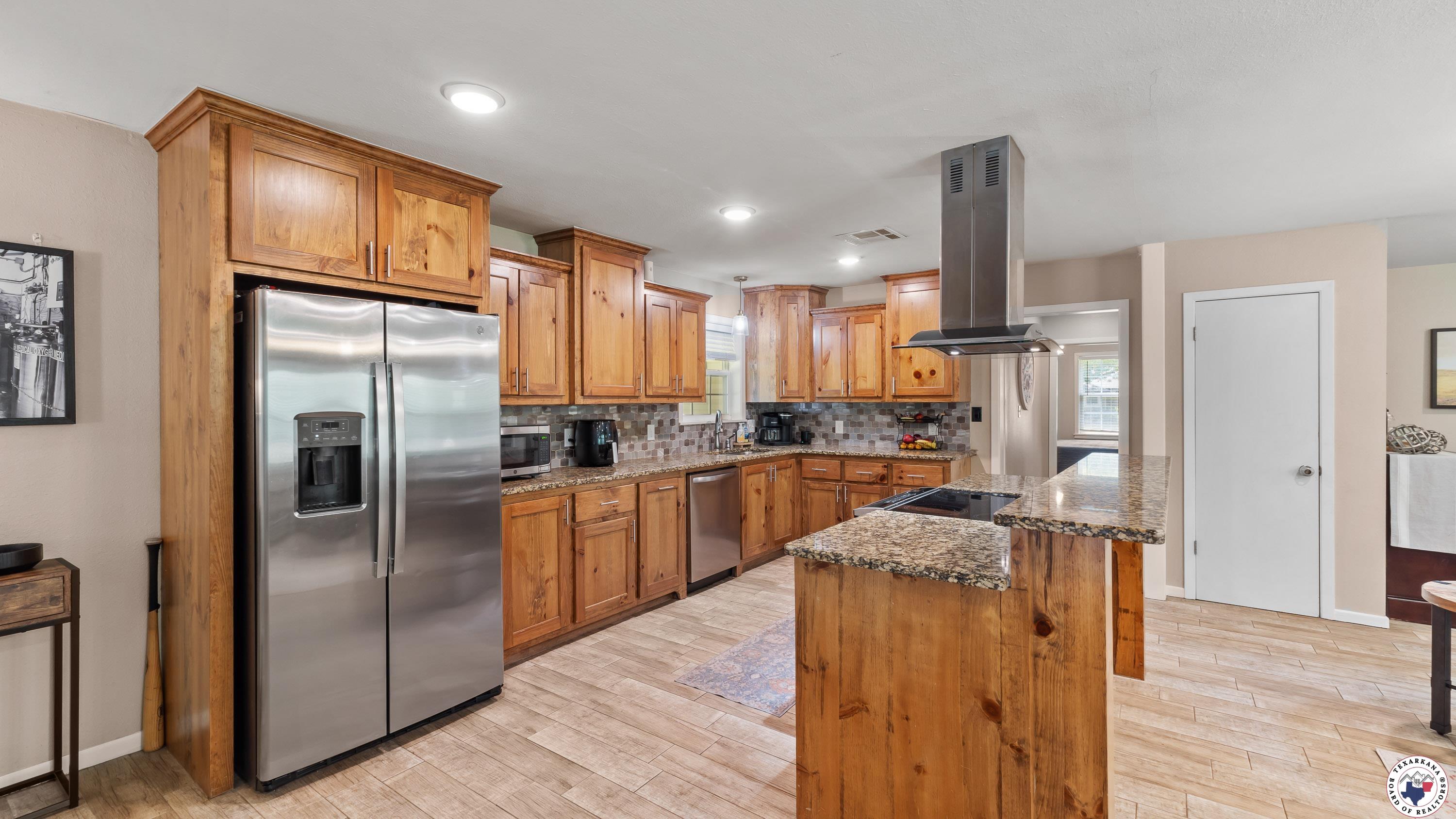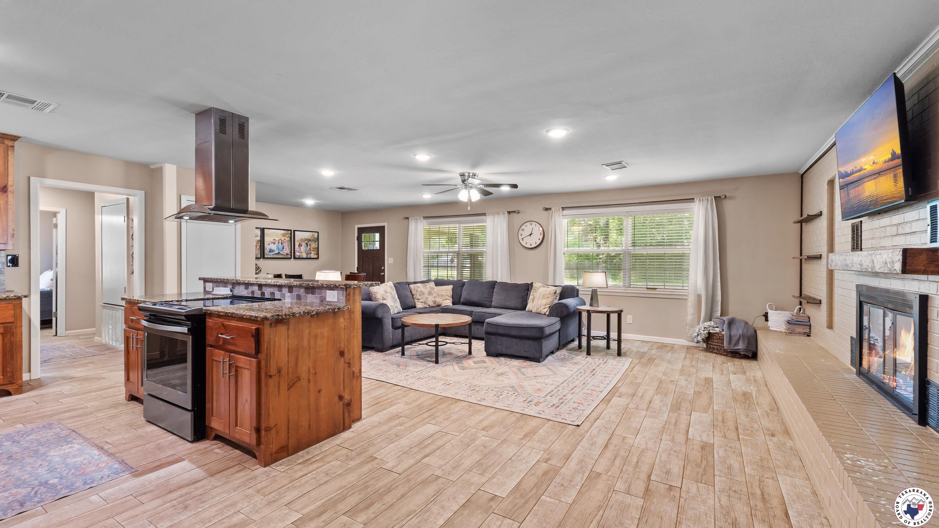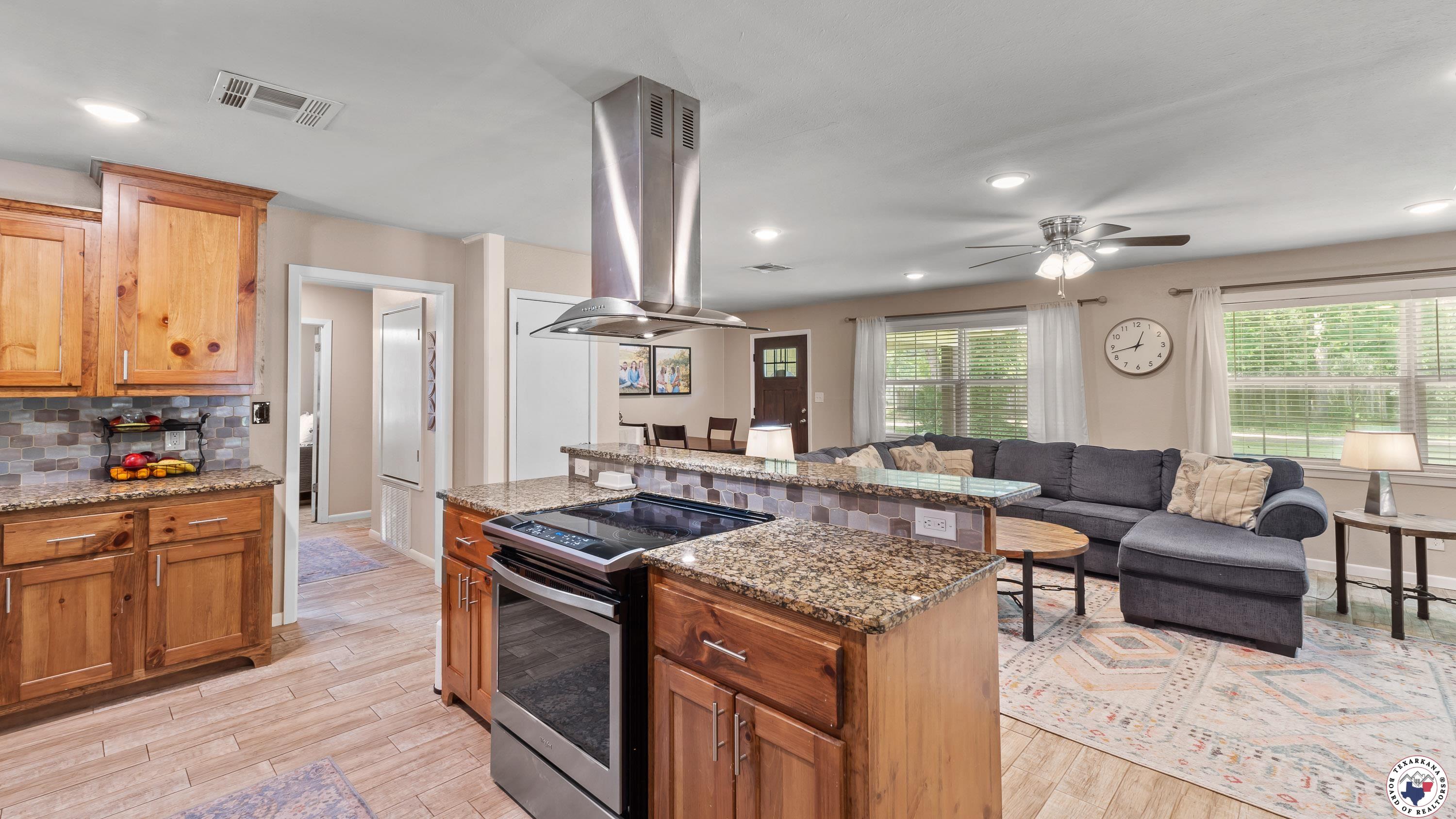 Looking for a versatile country home with over an acre of space to call your own? This charming property is nestled among towering hardwoods, offering a serene backdrop reminiscent of a simpler time. Picture kids playing in the expansive yard while you enjoy the shade of the trees. The property also features a small workshop, perfect for tools, hobbies, or extra storage. Inside, the home has been tastefully remodeled with an open concept design, creating a seamless flow between spaces. The kitchen, a true centerpiece, boasts Knotty Alder cabinetry stained in a rich fruitwood-inspired hue, paired beautifully with a large island overlooking the family area. Practicality meets style with low-maintenance tile flooring throughout, making cleaning a breeze with just a broom and mop. The main bathroom and primary shower are adorned with elegant tile surrounds that enhance the space while remaining easy to maintain. This home is designed for comfort and functionality, featuring a cozy full fireplace and a spacious laundry room. It's the perfect retreat with lower taxes in the area, plus the convenience of city water and sewer, all within the 2-mile jurisdiction. Conveniently located just 4 minutes from Highway 59 and 10 minutes from the I-30 Corridor, this property offers the best of both worlds--peaceful country living with easy access to major routes. With granite countertops, stainless steel appliances, spacious bedrooms, and a stunning natural setting, this home has everything you need to feel right at home. Schedule a showing today and see all this property has to offer!
