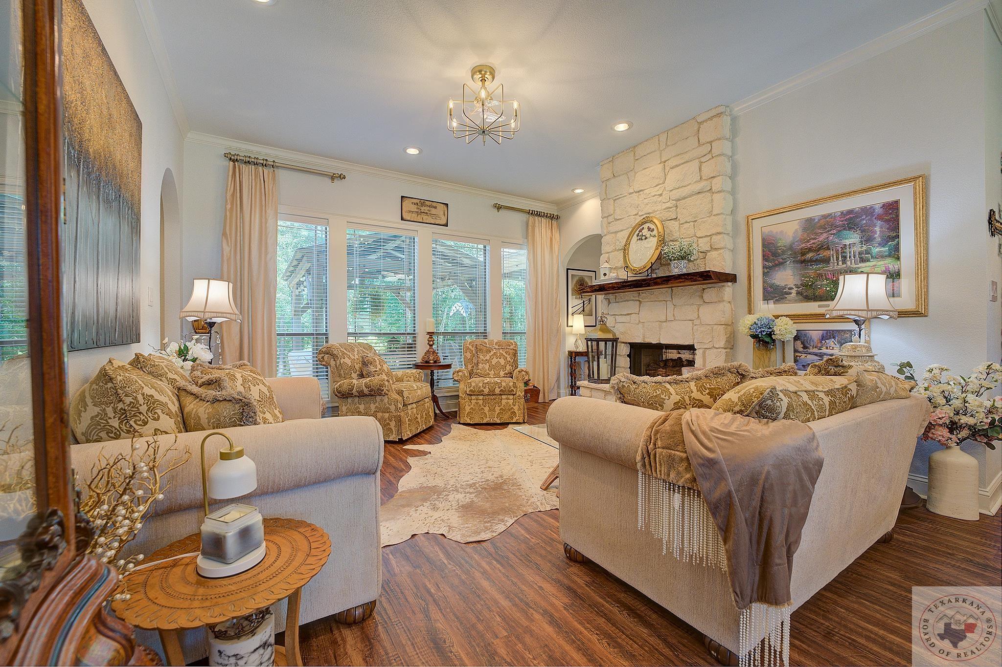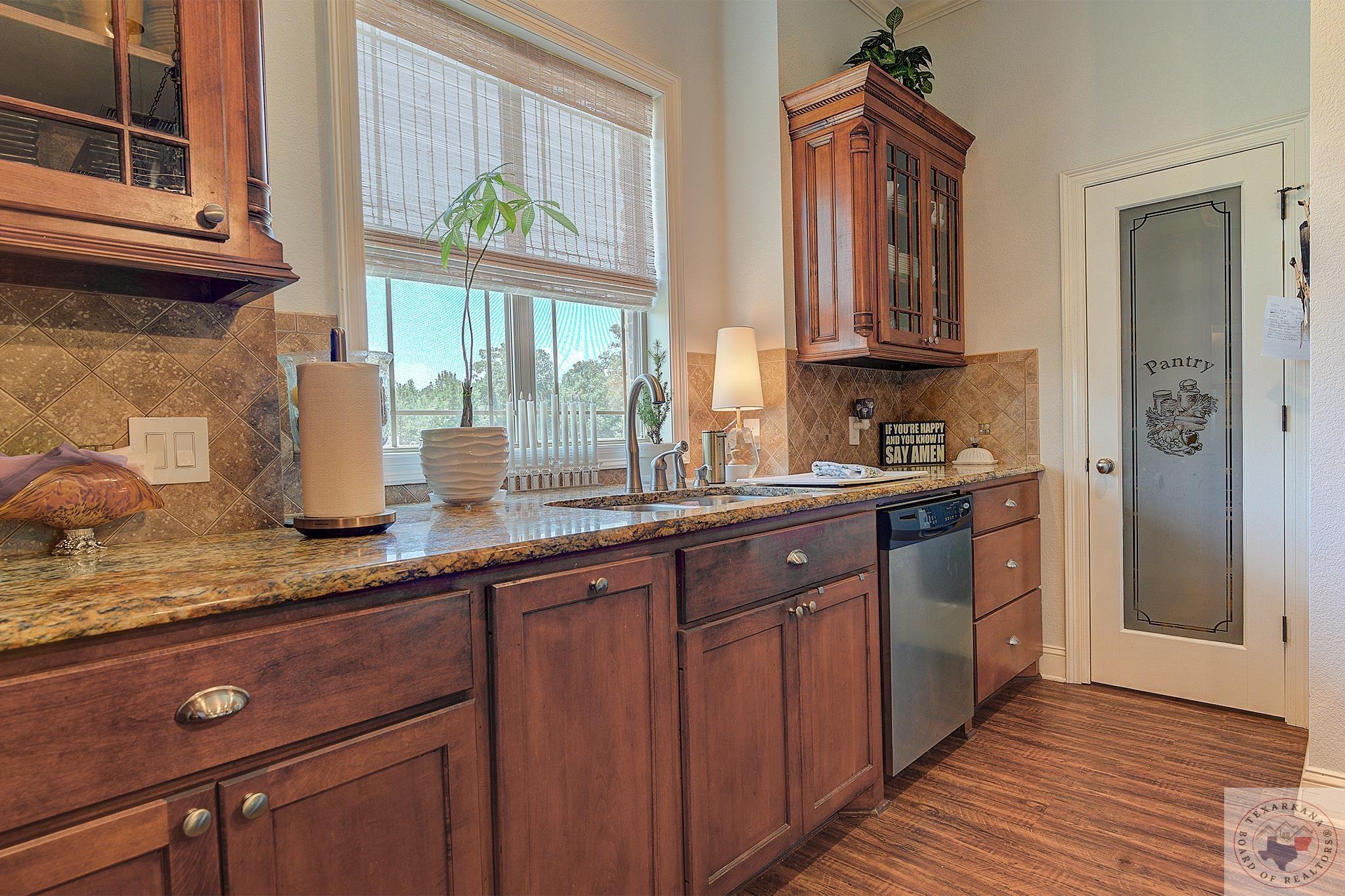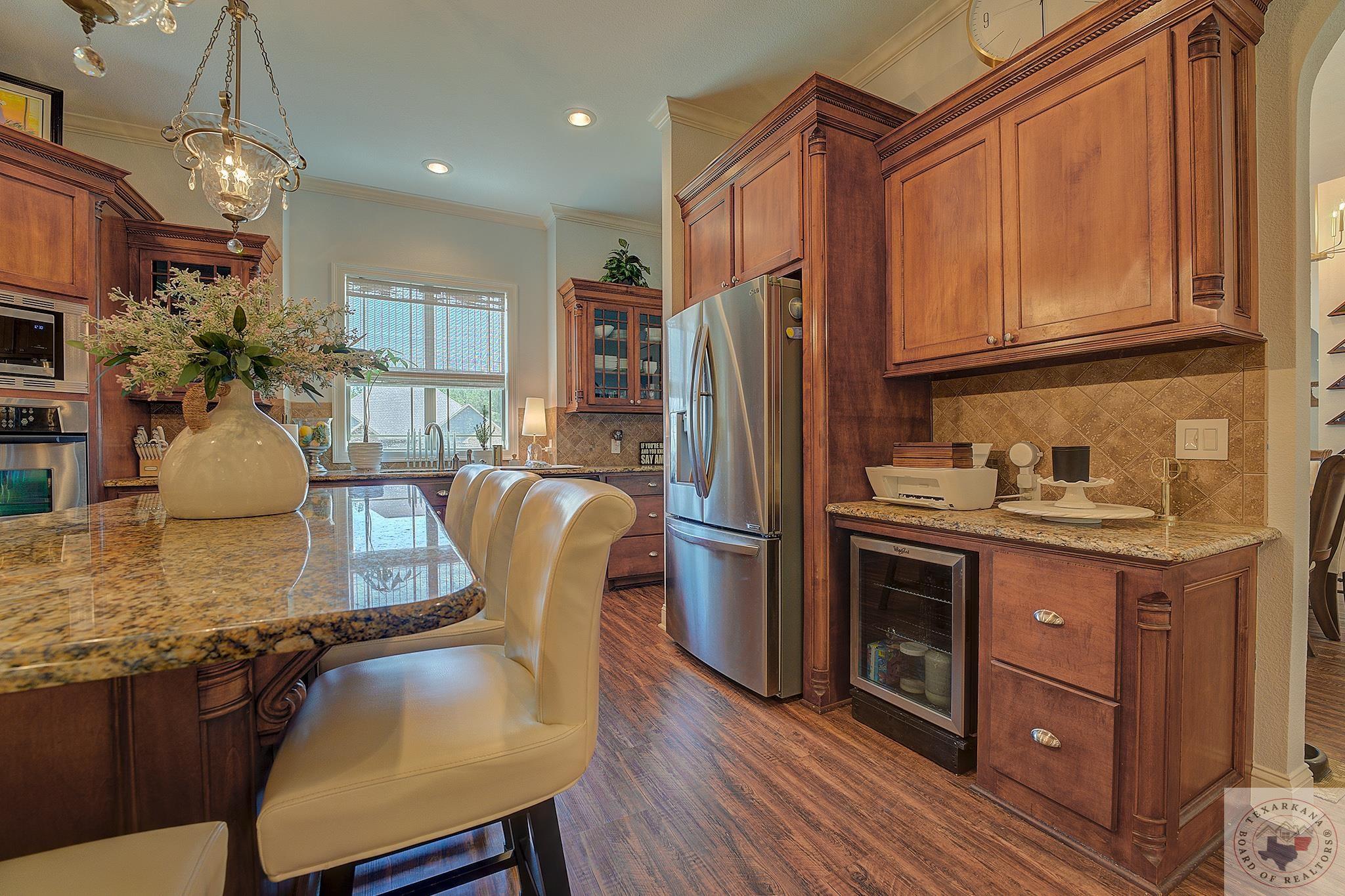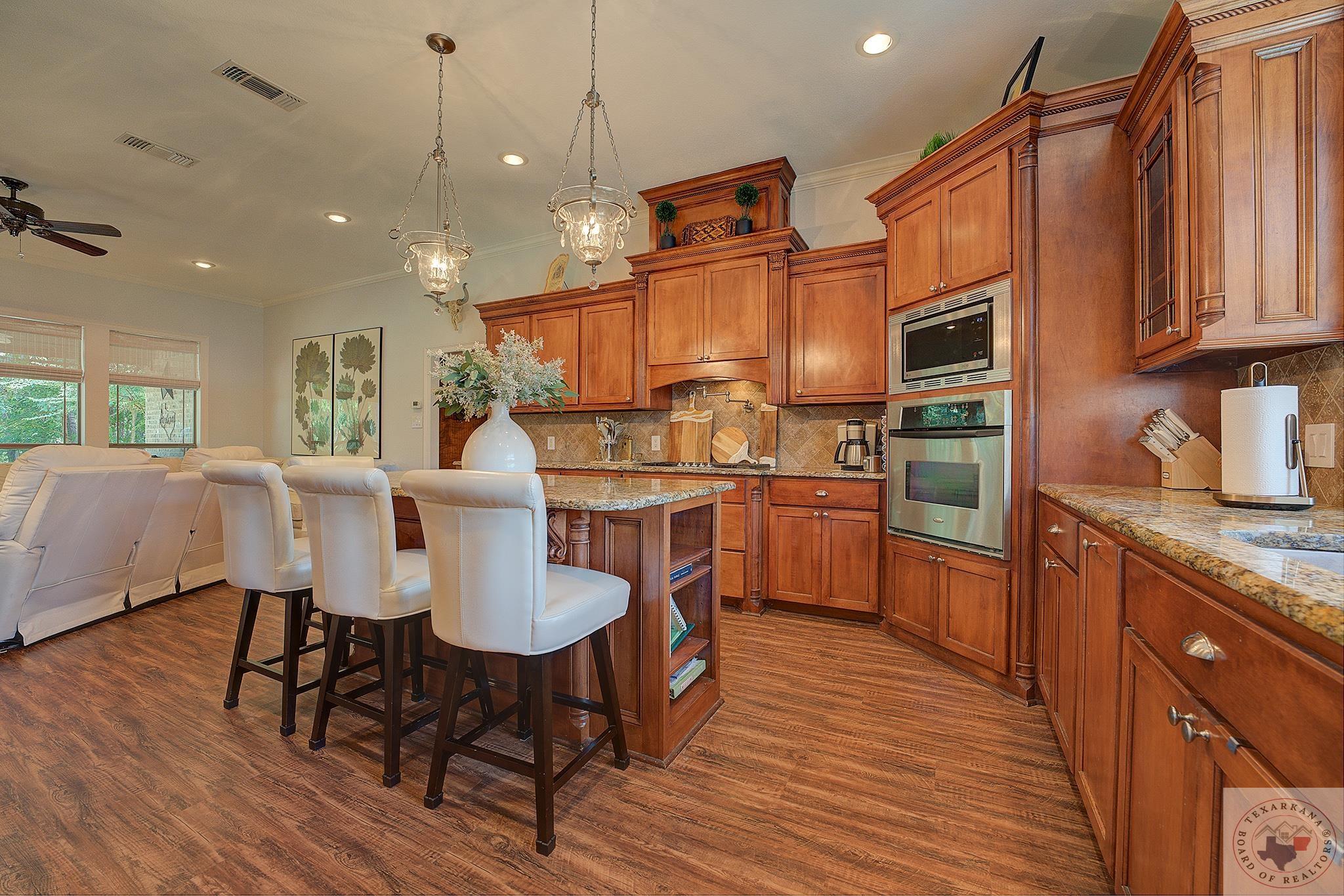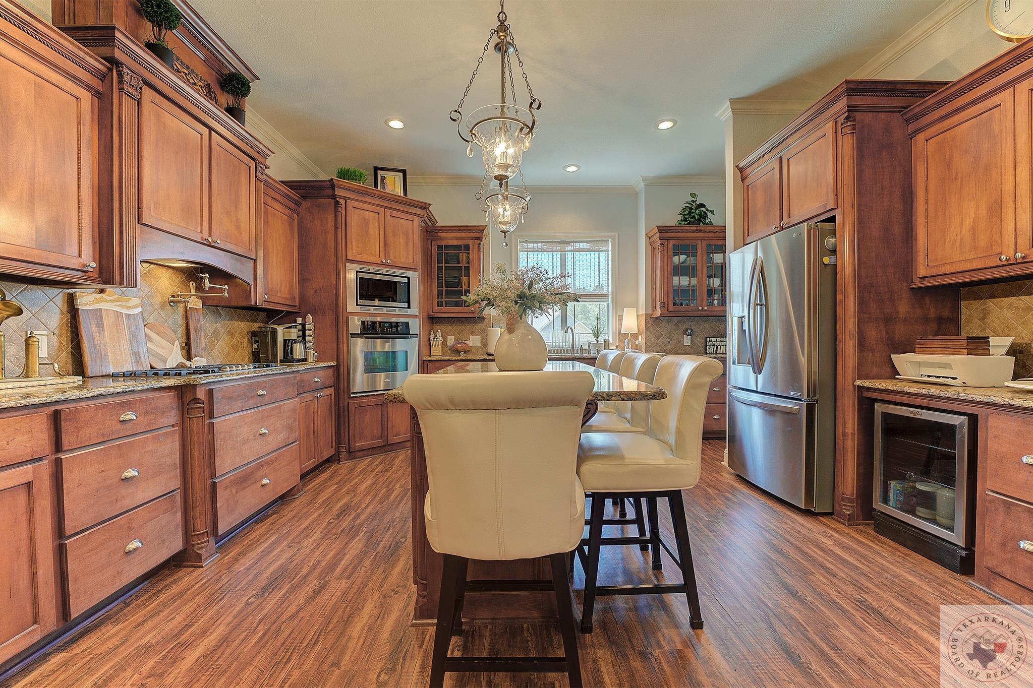 Discover the latest trends in home design featuring a beautiful blend of classic style and contemporary finishes. Marvel at the intricate woodwork details, the Tray Ceilings and the functional yet elegant Texas White Rock double-sided fireplace. The living has two areas, one for casual and one for formal and this opens to a chef's dream kitchen boasting of a stunning granite island with seating, for 4, and a convenient pot filler water spigot. Stylish rope trim on the cabinets with Glass Cabinet doors and Private pantry to store larger items. This Island and Desk, area are adjoining the Den. The cozy den is perfect for game nights or movie marathons along with a view of nature just beyond the patio. Outside, a gazebo awaits your hot tub, surrounded by a fenced yard for pets or kids. Enjoy the large covered patio with a view of the nearby lake. Need space for your tools? The garage's 3rd stall offers pegboard walls and a private bath that is connected for Heat and Air. Nestled in a friendly neighborhood, this home offers a picturesque vantage point from its ridge-top location. The Master is spacious, and has a free standing Shower with Glass enclosure, and two separate vanities. The closet is well appointed with wardrobes built in and multiple rods for separates. This can be your forever home dream come true.