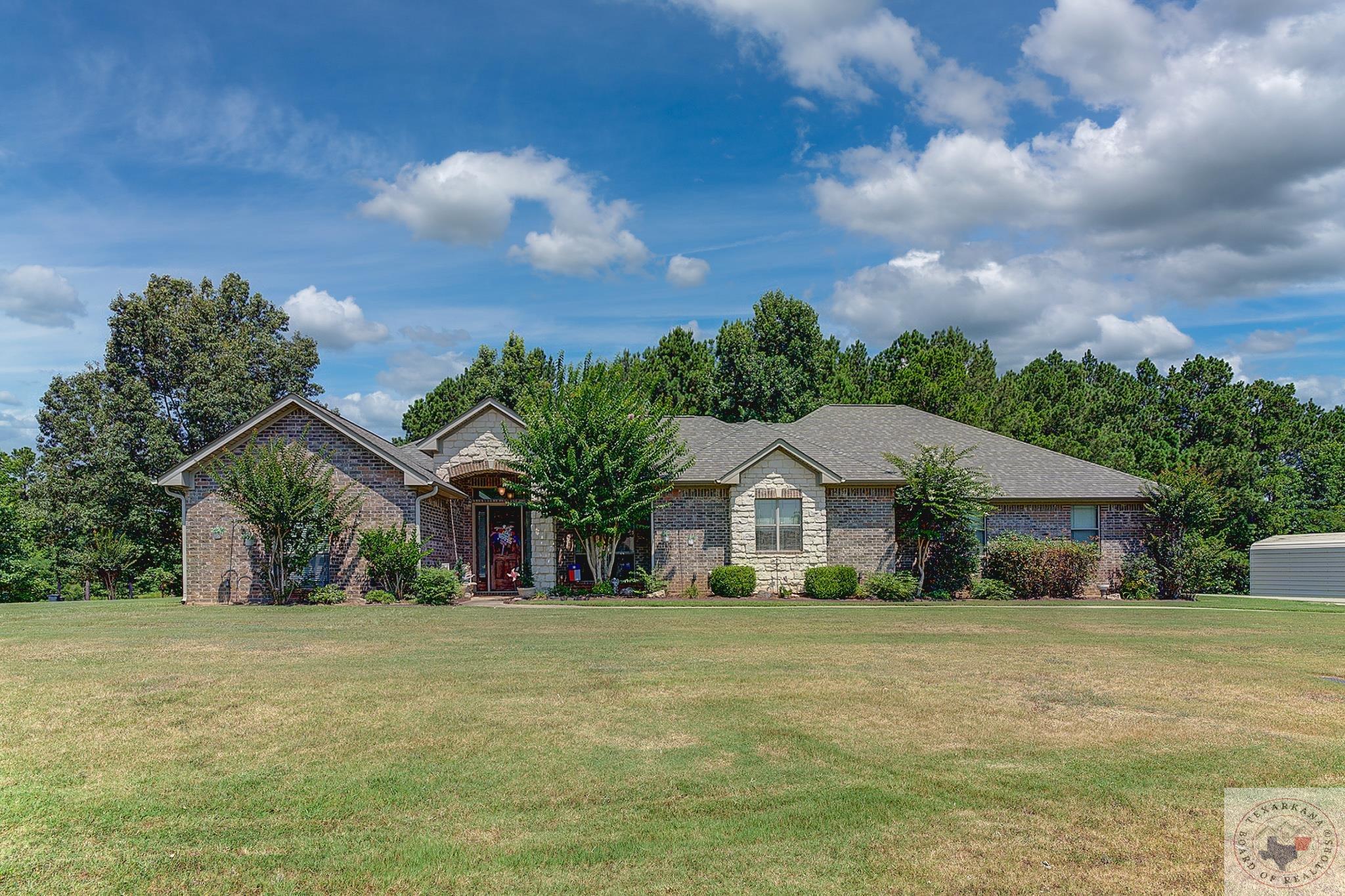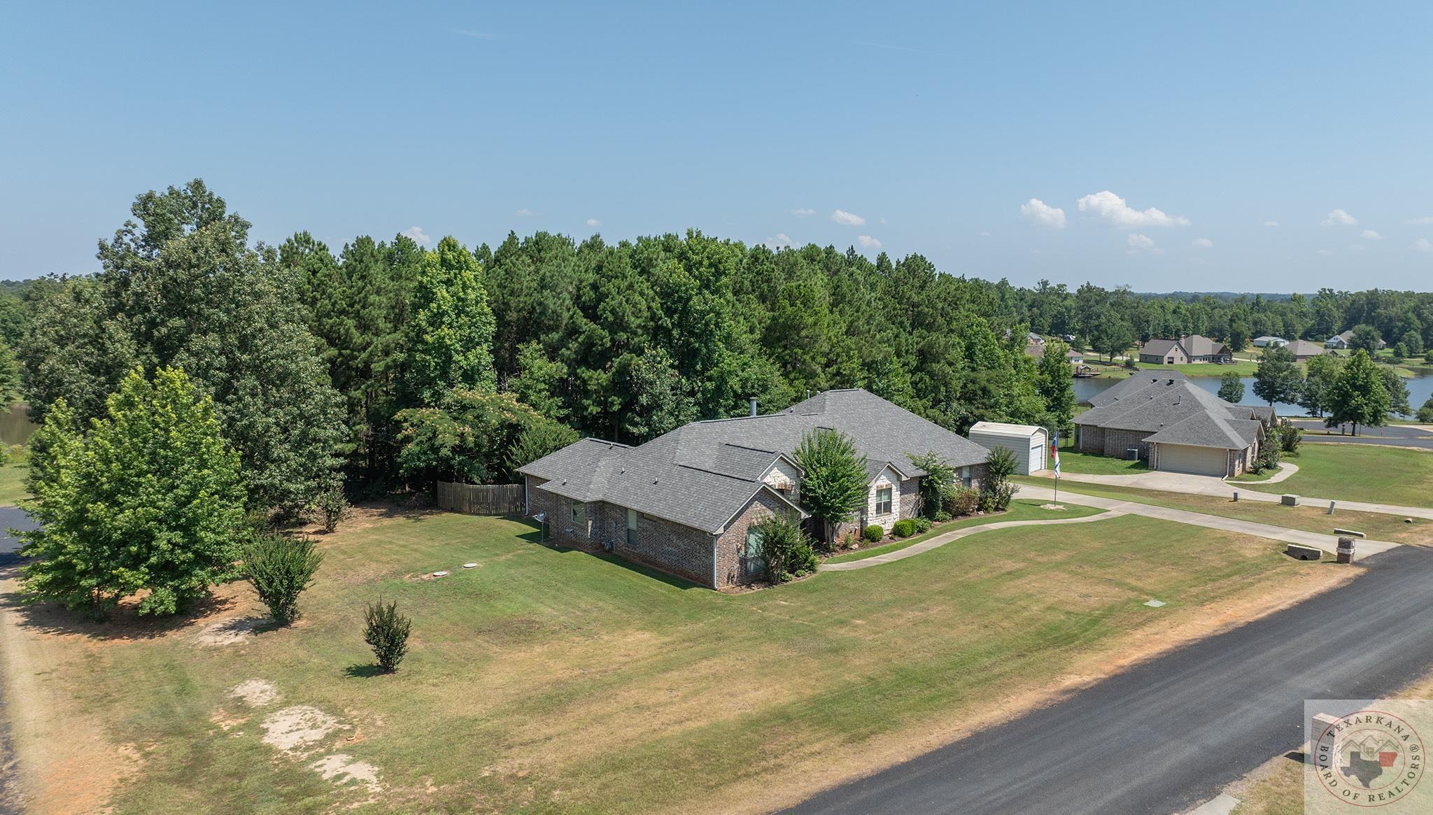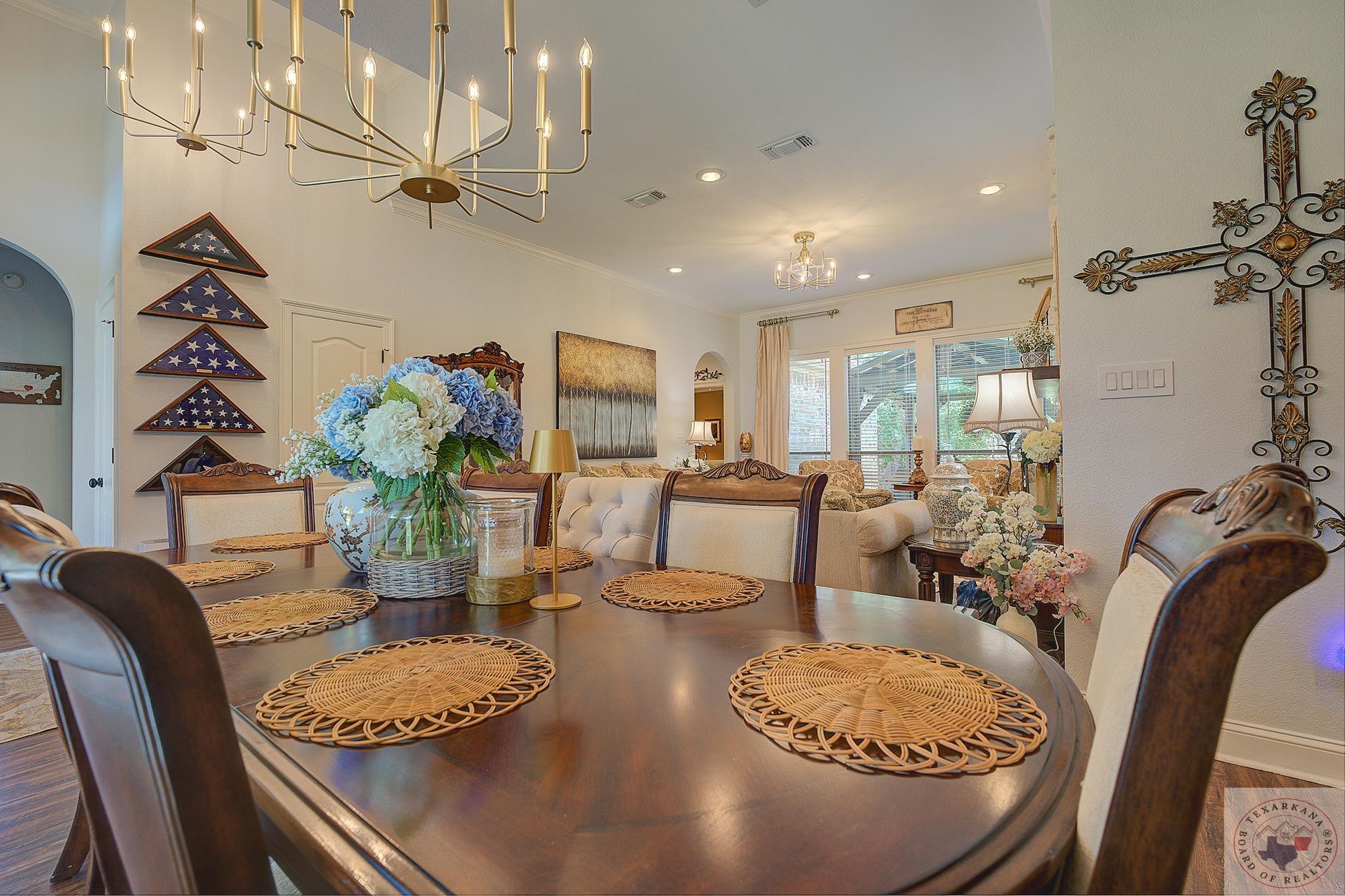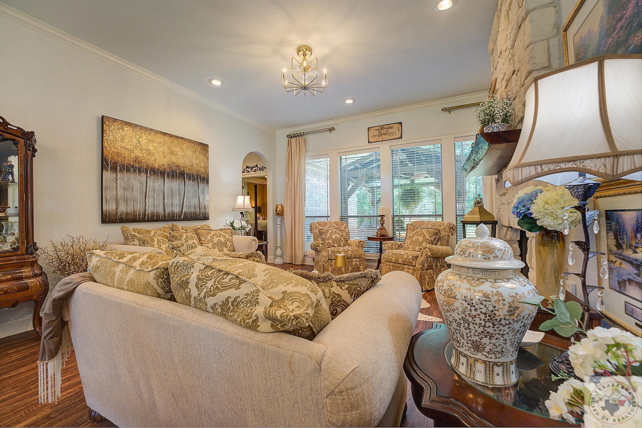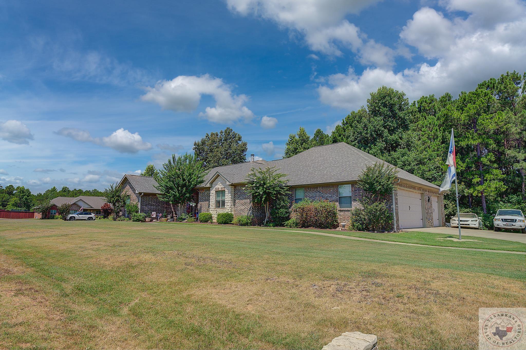 Discover the latest trends in home design featuring a beautiful blend of classic style and contemporary finishes. Marvel at the intricate woodwork details, the Tray Ceilings and the functional yet elegant Texas White Rock double-sided fireplace. The living has two areas, one for casual and one for formal and this opens to a chef's dream kitchen boasting of a stunning granite island with seating, for 4, and a convenient pot filler water spigot. Stylish rope trim on the cabinets with Glass Cabinet doors and Private pantry to store larger items. This Island and Desk, area are adjoining the Den. The cozy den is perfect for game nights or movie marathons along with a view of nature just beyond the patio. Outside, a gazebo awaits your hot tub, surrounded by a fenced yard for pets or kids. Enjoy the large covered patio with a view of the nearby lake. Need space for your tools? The garage's 3rd stall offers pegboard walls and a private bath that is connected for Heat and Air. Nestled in a friendly neighborhood, this home offers a picturesque vantage point from its ridge-top location. The Master is spacious, and has a free standing Shower with Glass enclosure, and two separate vanities. The closet is well appointed with wardrobes built in and multiple rods for separates. This can be your forever home dream come true.