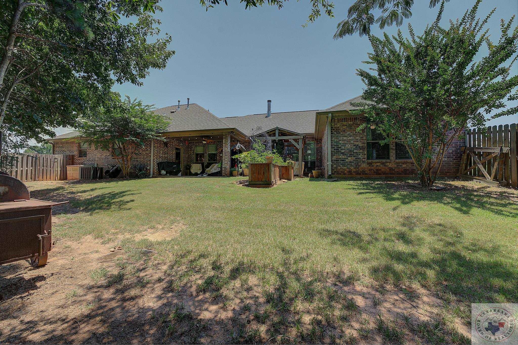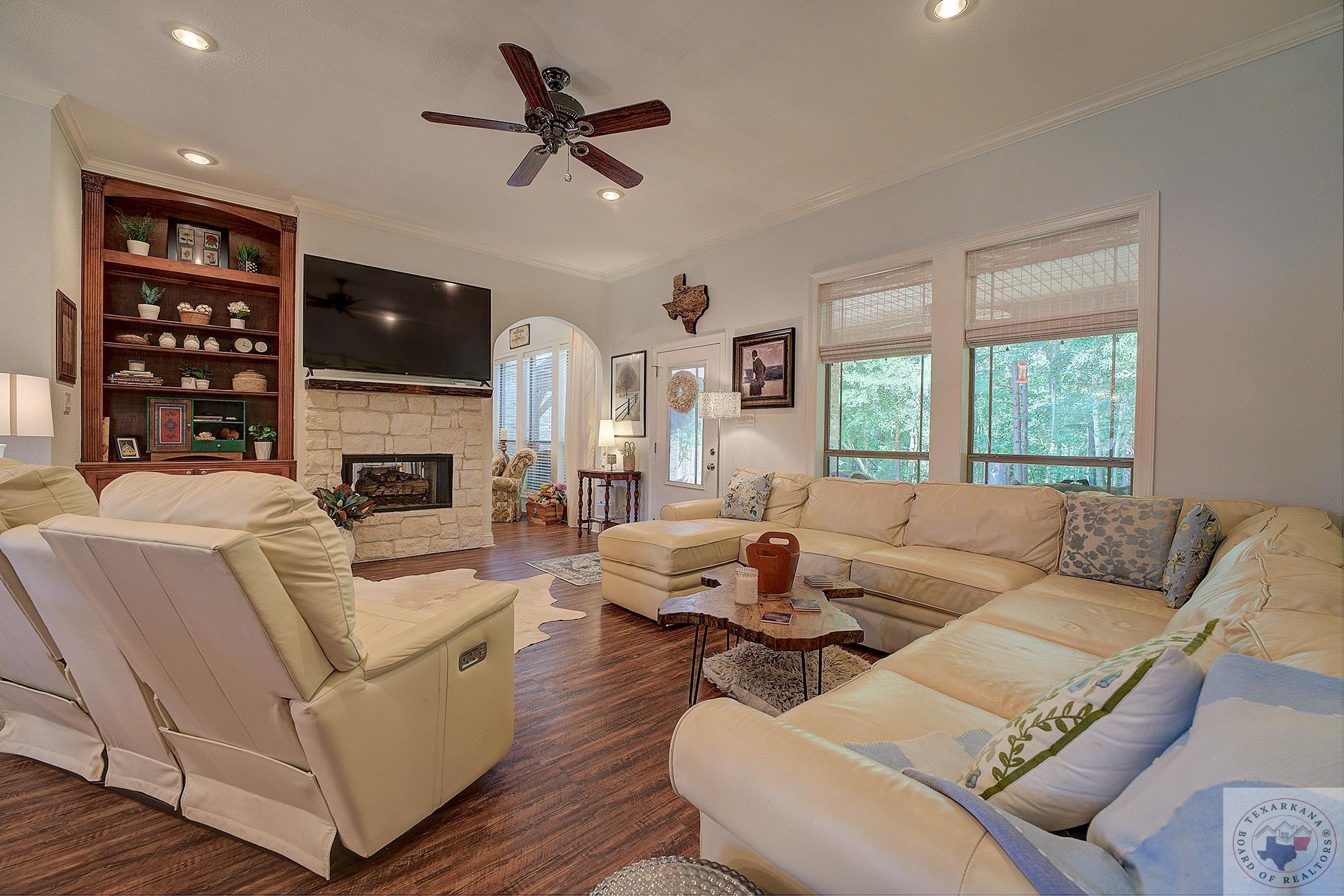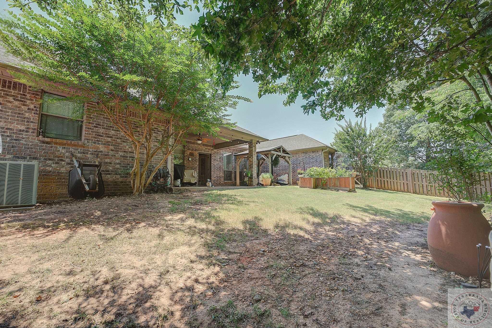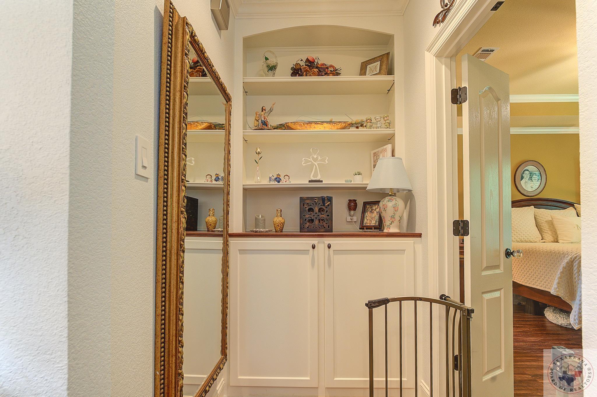 Discover the latest trends in home design featuring a beautiful blend of classic style and contemporary finishes. Marvel at the intricate woodwork details, the Tray Ceilings and the functional yet elegant Texas White Rock double-sided fireplace. The living has two areas, one for casual and one for formal and this opens to a chef's dream kitchen boasting of a stunning granite island with seating, for 4, and a convenient pot filler water spigot. Stylish rope trim on the cabinets with Glass Cabinet doors and Private pantry to store larger items. This Island and Desk, area are adjoining the Den. The cozy den is perfect for game nights or movie marathons along with a view of nature just beyond the patio. Outside, a gazebo awaits your hot tub, surrounded by a fenced yard for pets or kids. Enjoy the large covered patio with a view of the nearby lake. Need space for your tools? The garage's 3rd stall offers pegboard walls and a private bath that is connected for Heat and Air. Nestled in a friendly neighborhood, this home offers a picturesque vantage point from its ridge-top location. The Master is spacious, and has a free standing Shower with Glass enclosure, and two separate vanities. The closet is well appointed with wardrobes built in and multiple rods for separates. This can be your forever home dream come true.