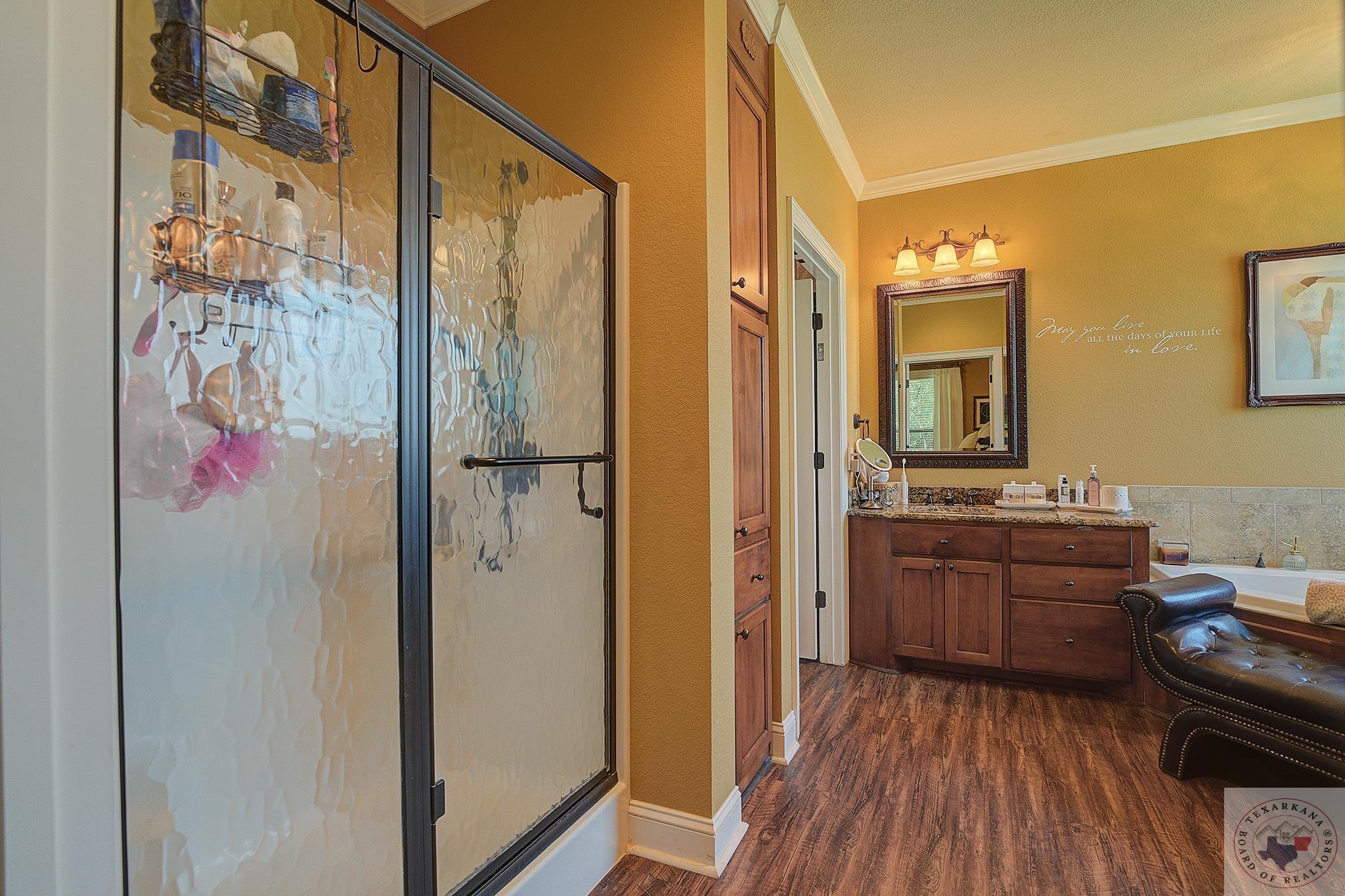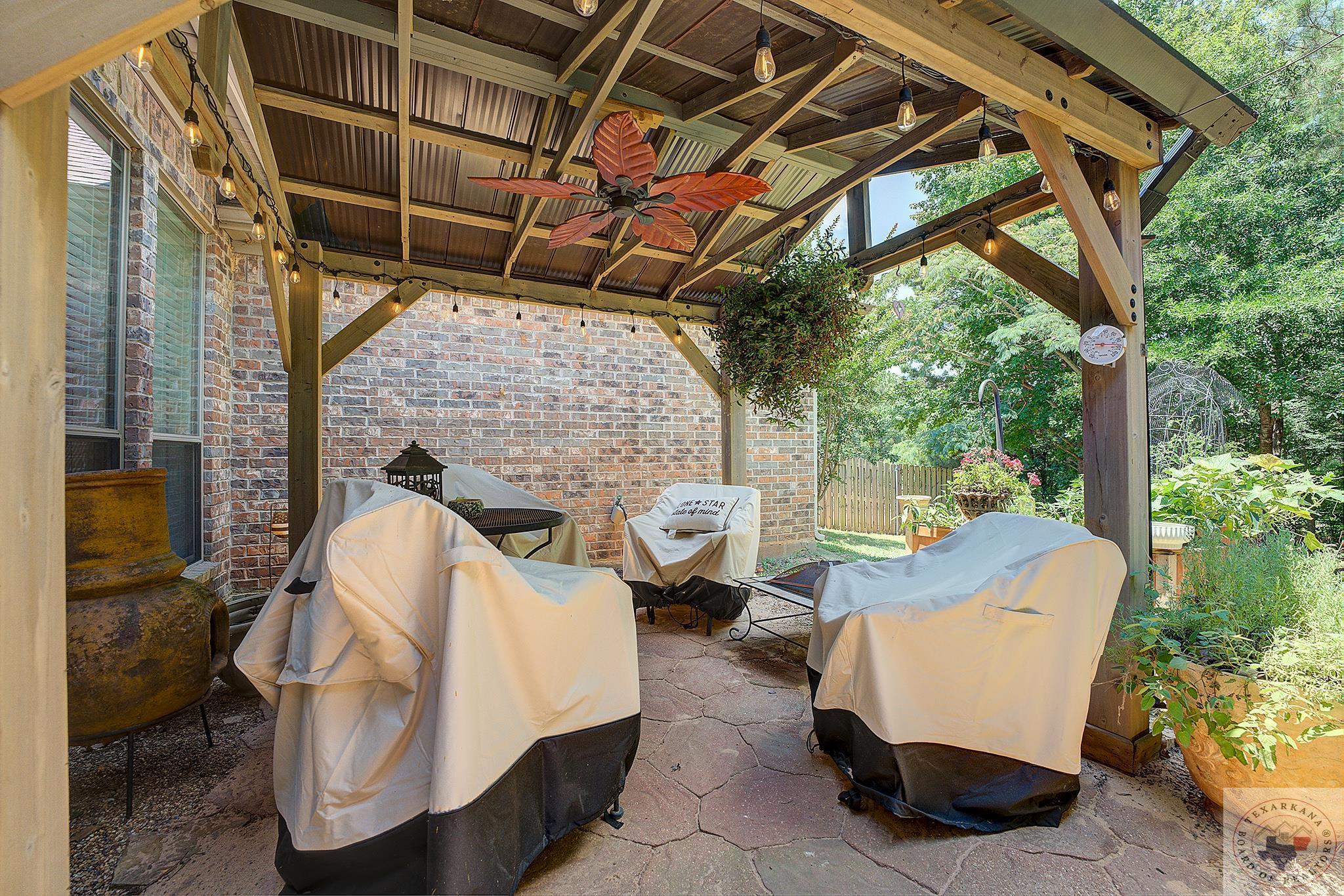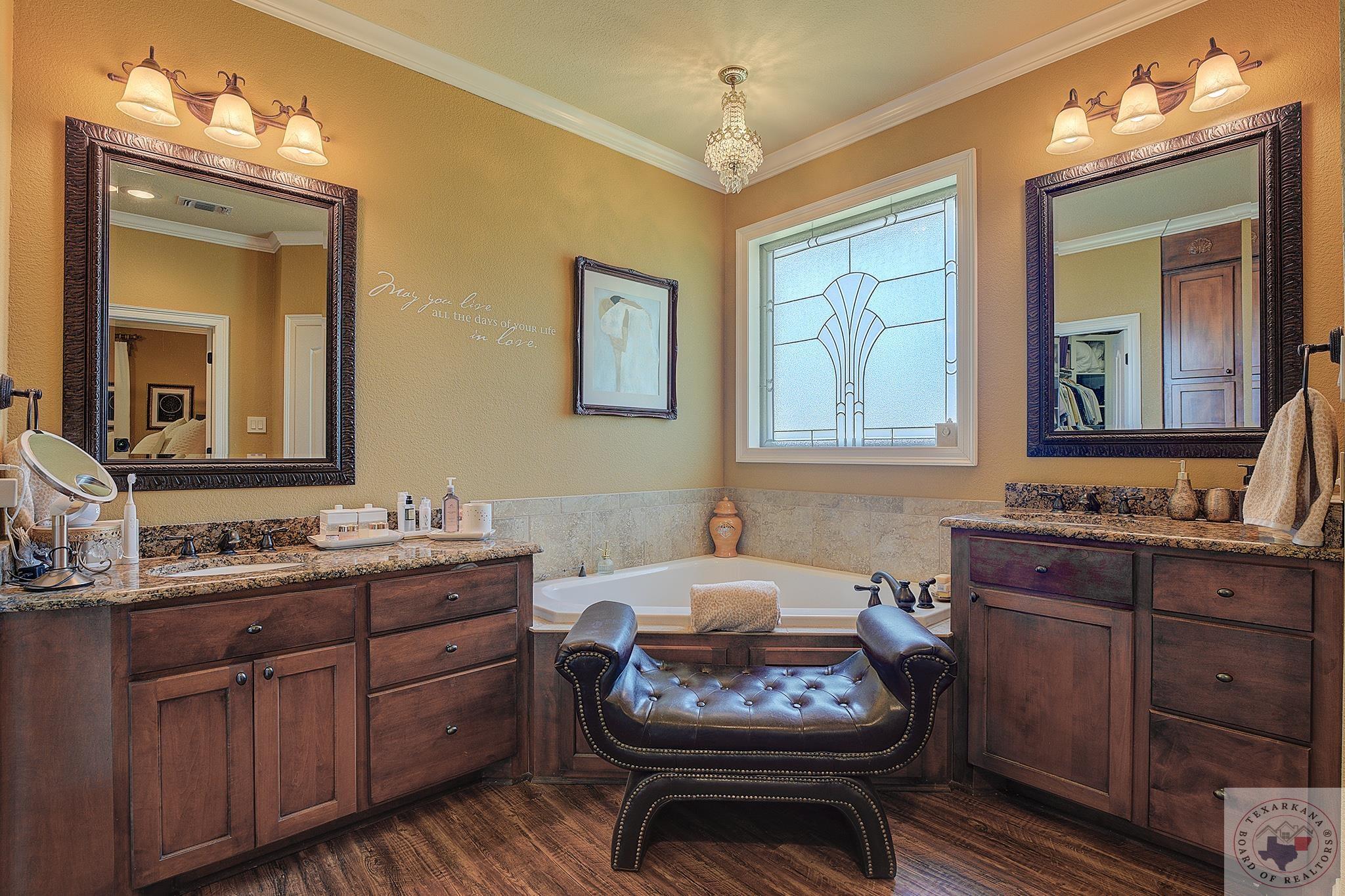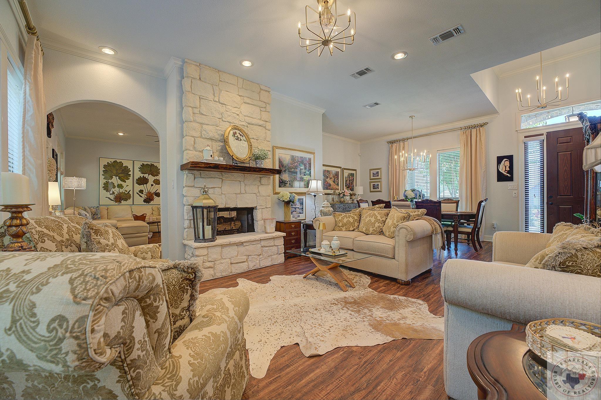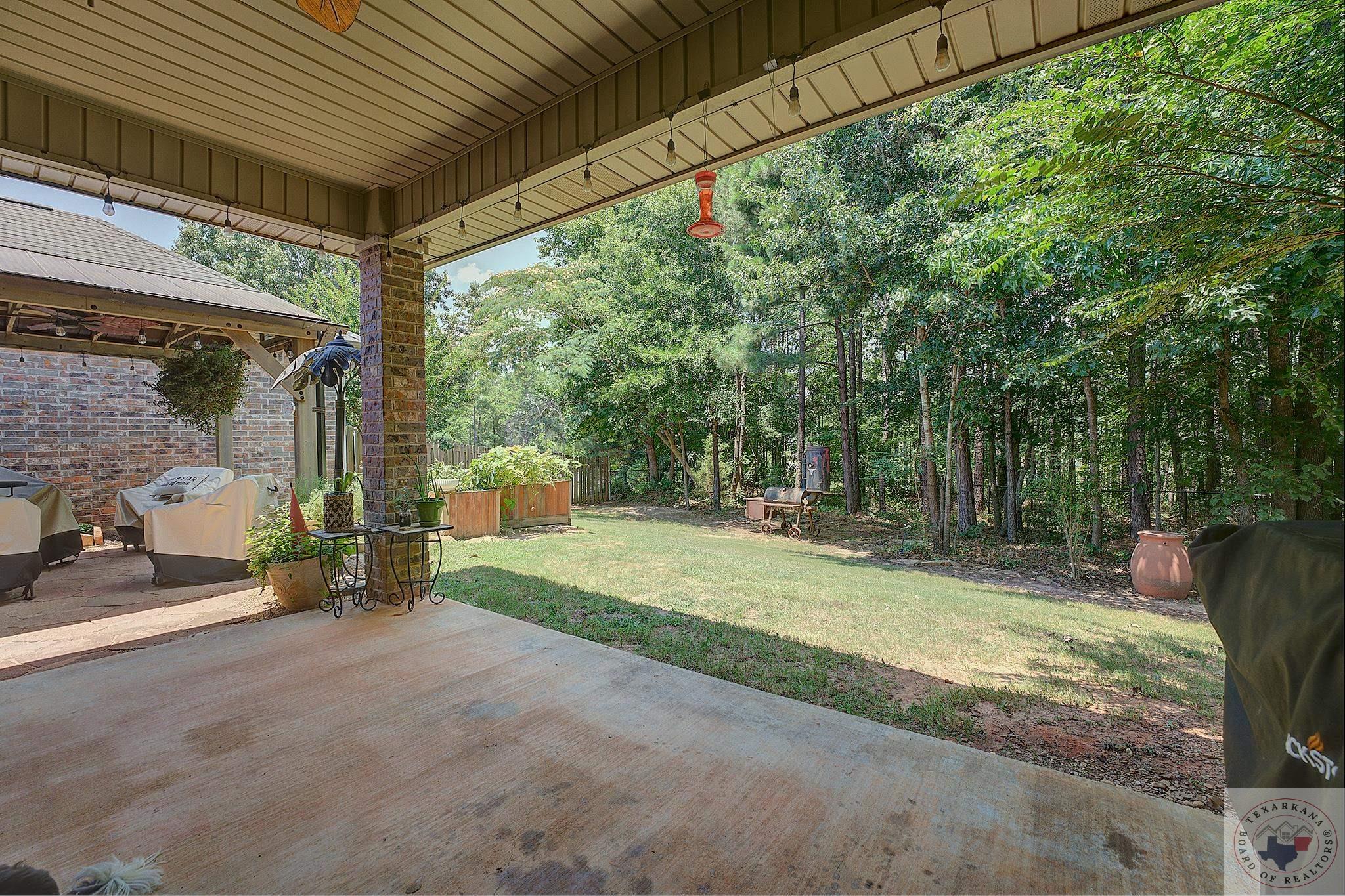 Discover the latest trends in home design featuring a beautiful blend of classic style and contemporary finishes. Marvel at the intricate woodwork details, the Tray Ceilings and the functional yet elegant Texas White Rock double-sided fireplace. The living has two areas, one for casual and one for formal and this opens to a chef's dream kitchen boasting of a stunning granite island with seating, for 4, and a convenient pot filler water spigot. Stylish rope trim on the cabinets with Glass Cabinet doors and Private pantry to store larger items. This Island and Desk, area are adjoining the Den. The cozy den is perfect for game nights or movie marathons along with a view of nature just beyond the patio. Outside, a gazebo awaits your hot tub, surrounded by a fenced yard for pets or kids. Enjoy the large covered patio with a view of the nearby lake. Need space for your tools? The garage's 3rd stall offers pegboard walls and a private bath that is connected for Heat and Air. Nestled in a friendly neighborhood, this home offers a picturesque vantage point from its ridge-top location. The Master is spacious, and has a free standing Shower with Glass enclosure, and two separate vanities. The closet is well appointed with wardrobes built in and multiple rods for separates. This can be your forever home dream come true.